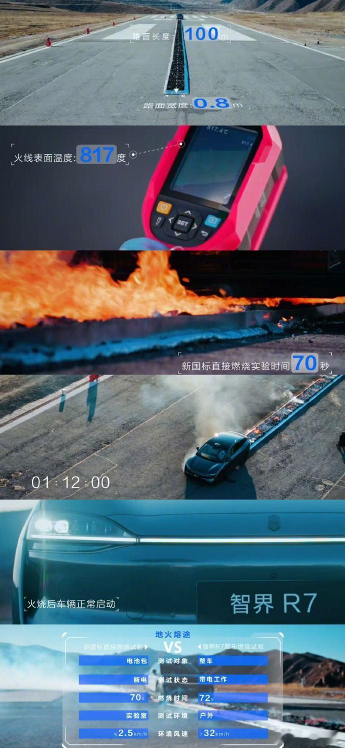 智界 R7 十万公里电池安全挑战 新能源车除了续航能力和智能系统之外,必须电池安全是底线!智界直接用硬核测试说话,把安全从 “纸面承诺” 变成看得见的放心感!智界新S7、R7搭载华为巨鲸800V高压电池,三项测试直接刷新行业标准:十万公里实测电池健康度仍有 97%,衰减慢到离谱!!另外也做了一些比较严格的烈性实验,800℃高温火焰炙烤72秒,超国标要求;三元锂户外针刺测试仅冒烟无明火,BMS毫秒级预警,双闪自动开启,门把手弹出,危险时刻留足逃生时间。建议关注一下这样的“超标”测试