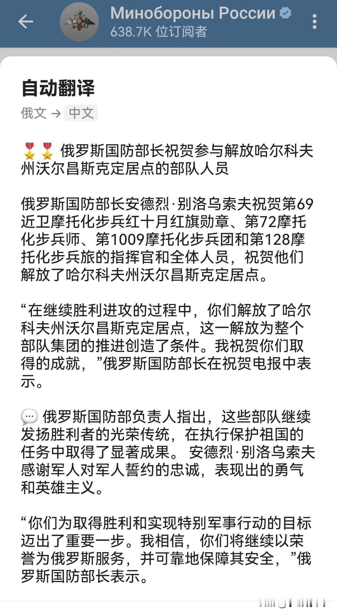 🎖🎖 俄罗斯国防部长别洛乌索夫证实完全解放了哈尔科夫州沃尔昌斯克市,并向解放该市的第69近卫摩托化步兵师、第72摩托化步兵师、第1009摩托化步兵团和第128摩托化步兵旅的指挥官和全体人员表示祝贺。