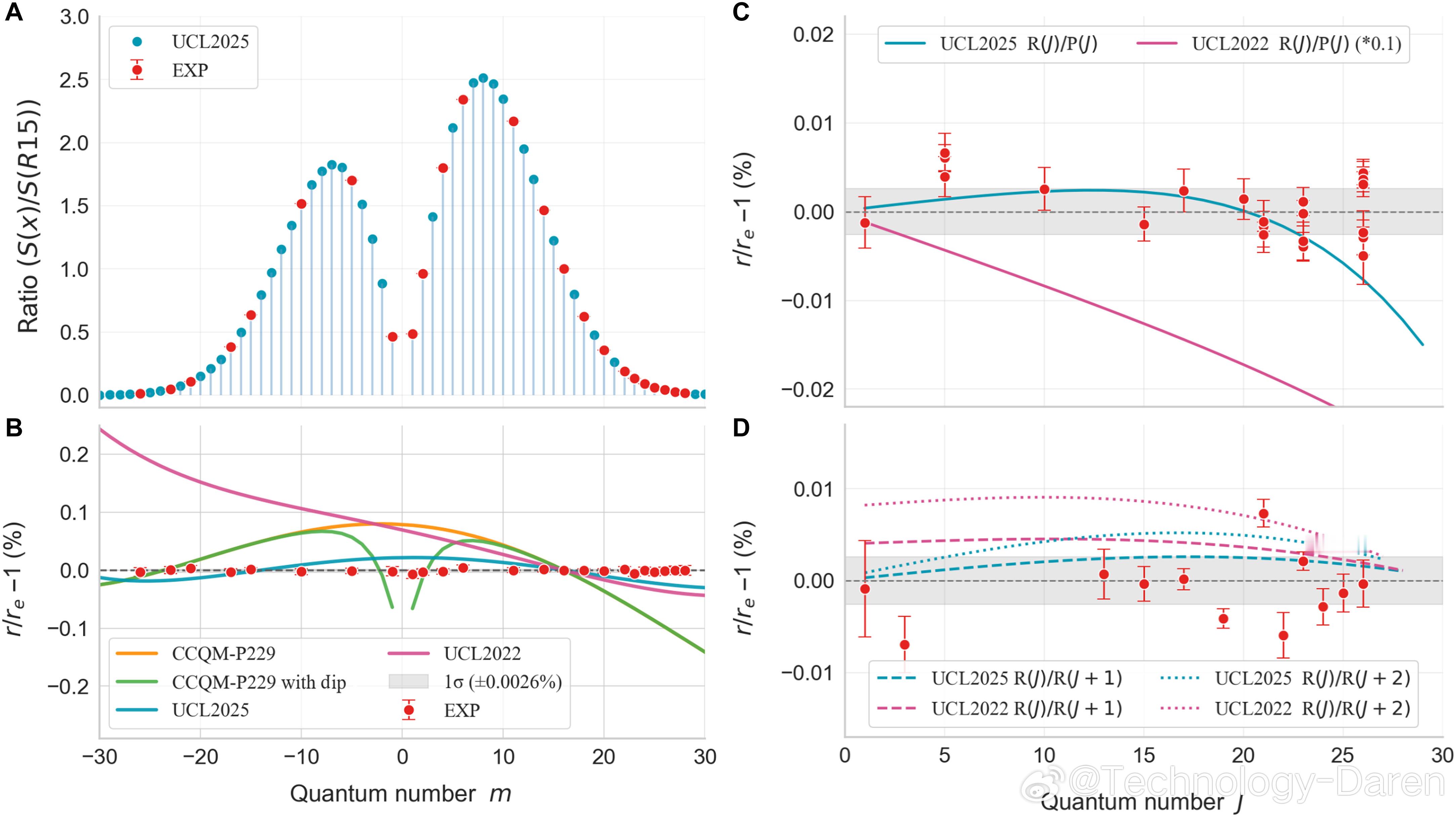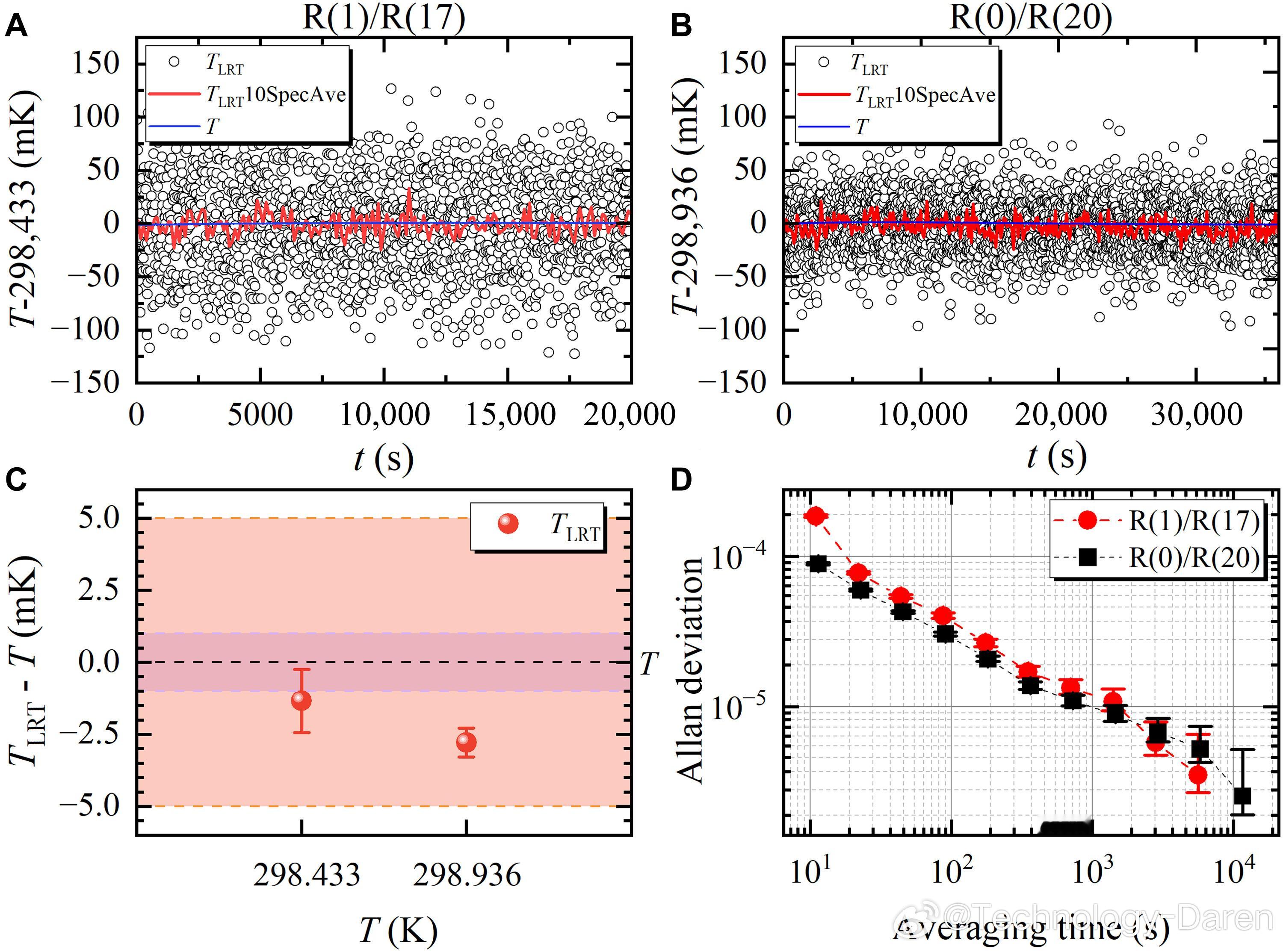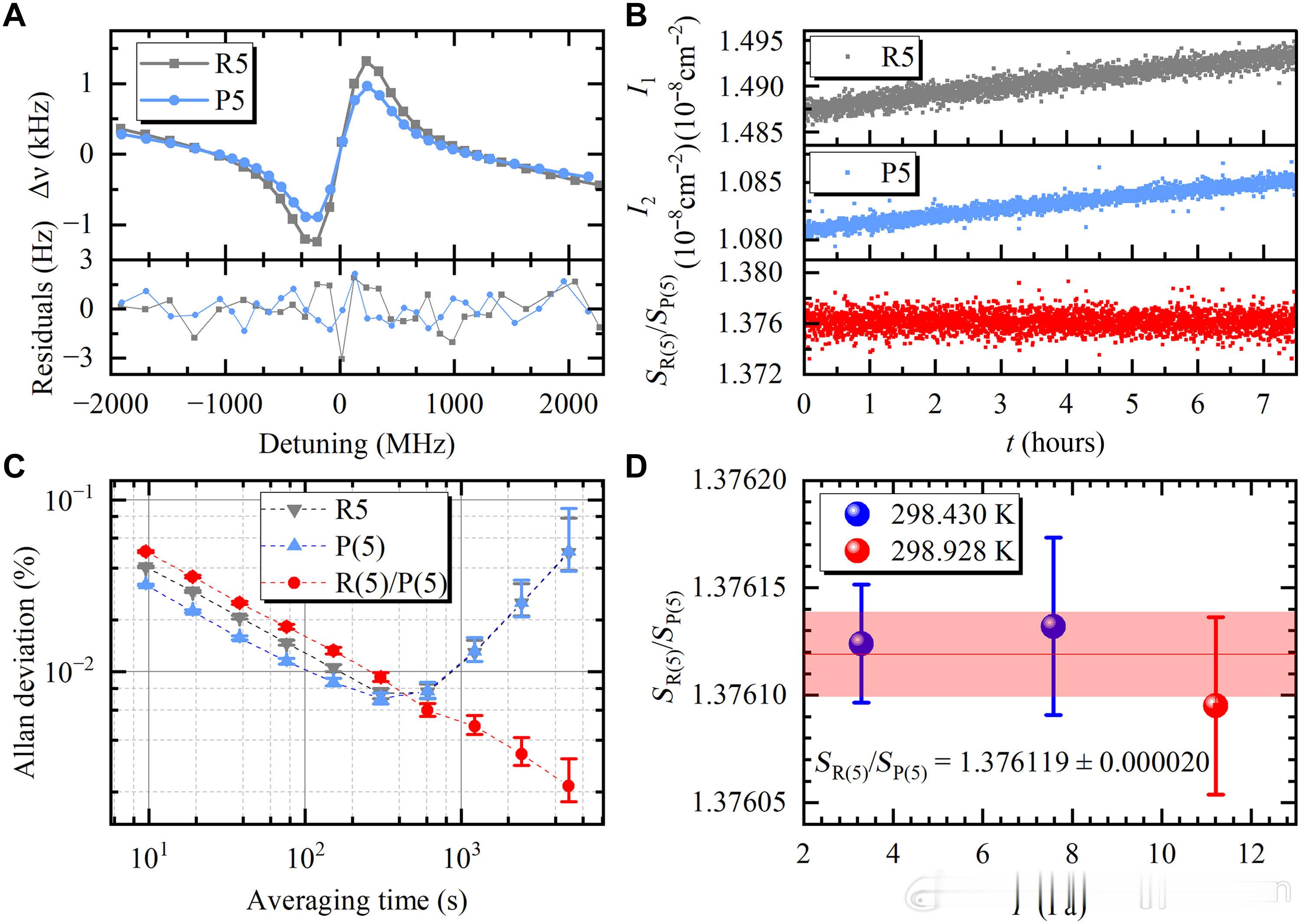 中国科大刷新光谱学温度计量精度纪录 中国科学技术大学教授胡水明团队在温度基准测量领域取得重要进展,采用全频域测量方法,实现了无线型模型依赖的ppm级精度多普勒展宽测温(DBT)。11月25日,研究成果发表于《物理评论快报》。该成果与团队此前在《科学进展》上发表的线强度比测温法工作形成互补,创造了光谱学温度计量精度的国际新纪录。温度是国际单位制中最后一个被重新定义的基本单位,目前开尔文的定义直接基于玻尔兹曼常数。多普勒展宽测温法作为一种重要的原级测温方法,通过测量原子或分子热运动导致的谱线展宽来直接反演温度。然而,分子碰撞效应和传统光谱测量方法的局限性一直是制约其精度提升的关键因素。研究团队采用腔模色散光谱技术,实现了从“光强测量”到“频率测量”的范式转变。研究团队采用模式线宽仅为0.6千赫兹的高精细度光学腔,选择最简单的双原子分子一氧化碳第二泛频振转跃迁作为测量对象,在2至17帕的低气压条件下记录光谱数据。实验采用低气压测量与零压外推的策略,有效剥离了分子碰撞对谱线展宽的干扰。而高精细度光腔的使用,使得测量灵敏度大幅提高,在低气压下还能获得足够的探测信噪比。实验结果显示,多普勒展宽测温值与标准铂电阻温度计的偏差仅为-2.0±3.6毫开尔文,统计不确定度7ppm,系统不确定度9ppm,首次将系统不确定度控制到10ppm以内。值得注意的是,即使采用不同的线型模型进行分析,压力外推后结果都呈现出良好的一致性,表明该方法摆脱了对线型模型的依赖。这是该领域一个长期存在的系统性难题,而前期国际上多个研究组的相关工作都受限于该效应。该工作得到审稿人高度评价:“这是从20年前提出DBT方法以来最重要的概念性突破”。这项工作建立的测量平台不仅为温度计量提供了新标准,还将应用于分子碰撞物理研究、大气环境遥感监测等多个领域。特别值得一提的是,该技术为验证分子碰撞理论提供了前所未有的高精度平台,对大气遥感、气体计量等学科发展具有重要意义。研究团队表示,这一系列温度计量突破性进展展示了我国在量子计量领域的技术创新能力,为未来温度量子计量的新标准奠定了坚实基础。最新科技消息相关论文信息:网页链接