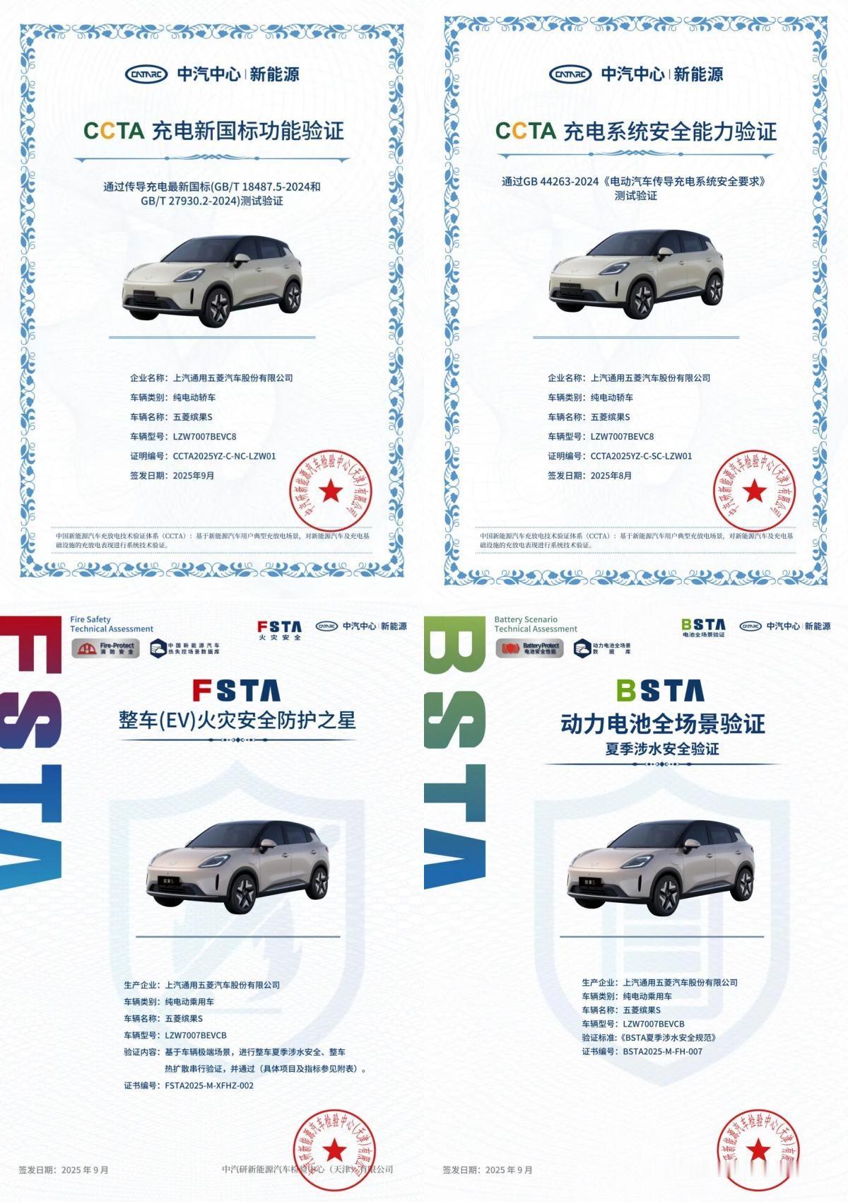 告别电池安全焦虑!缤果S用四项大奖回应:安全我负责。 大家在选择电车时,电池安全一定是咱们关心的头等大事。而刚上市的缤果S,似乎给出了一个敢打包票的答案。该车搭载的“神炼电池”,已先后拿下四项电池领域权威安全证书。 如在11月举行的2025第三届新能源汽车电安全大会上,缤果S荣获了“BSTA动力电池全场景验证夏季涉水安全验证”、“FSTA整车EV火灾安全防护之星”双项荣誉。早些时候,缤果S还斩获了CCTA充电新国标功能验证及CCTA充电系统安全能力验证两项证书。 简单来说,这四项证书的背后,意味着缤果S电池包经历了底部磕碰、撞击、涉水、高温(BSTA & FSTA验证),并在不同省市、不同运营商充电桩上频繁充放电(CCTA验证),都能保持极高稳定性,且不出现安全险情。而这些测试,远比咱们日常用车环境更严苛。 当然,这一套“安全组合拳”下来,缤果S也用不容置疑的测试数据,给所有用户吃了一颗定心丸,真正做到“防患于未然”。不得不说,号称“300万销量0碰撞自燃”的五菱神炼电池,确实有几把刷子。