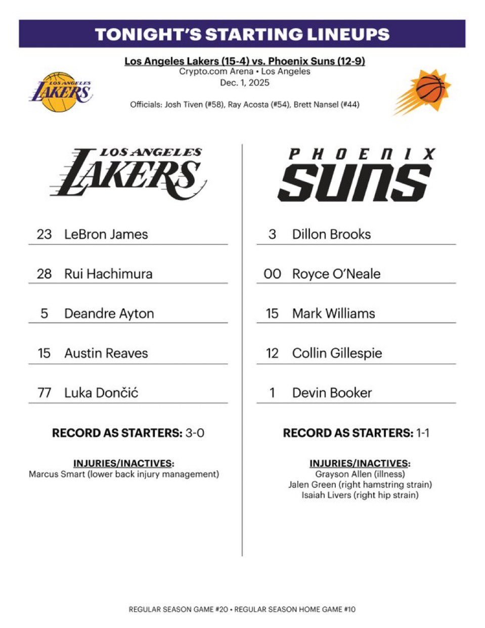 湖人首发:东契奇、里夫斯、八村塁、詹姆斯、艾顿太阳首发:布克、吉莱斯皮、奥尼尔、狄龙、马威📺: