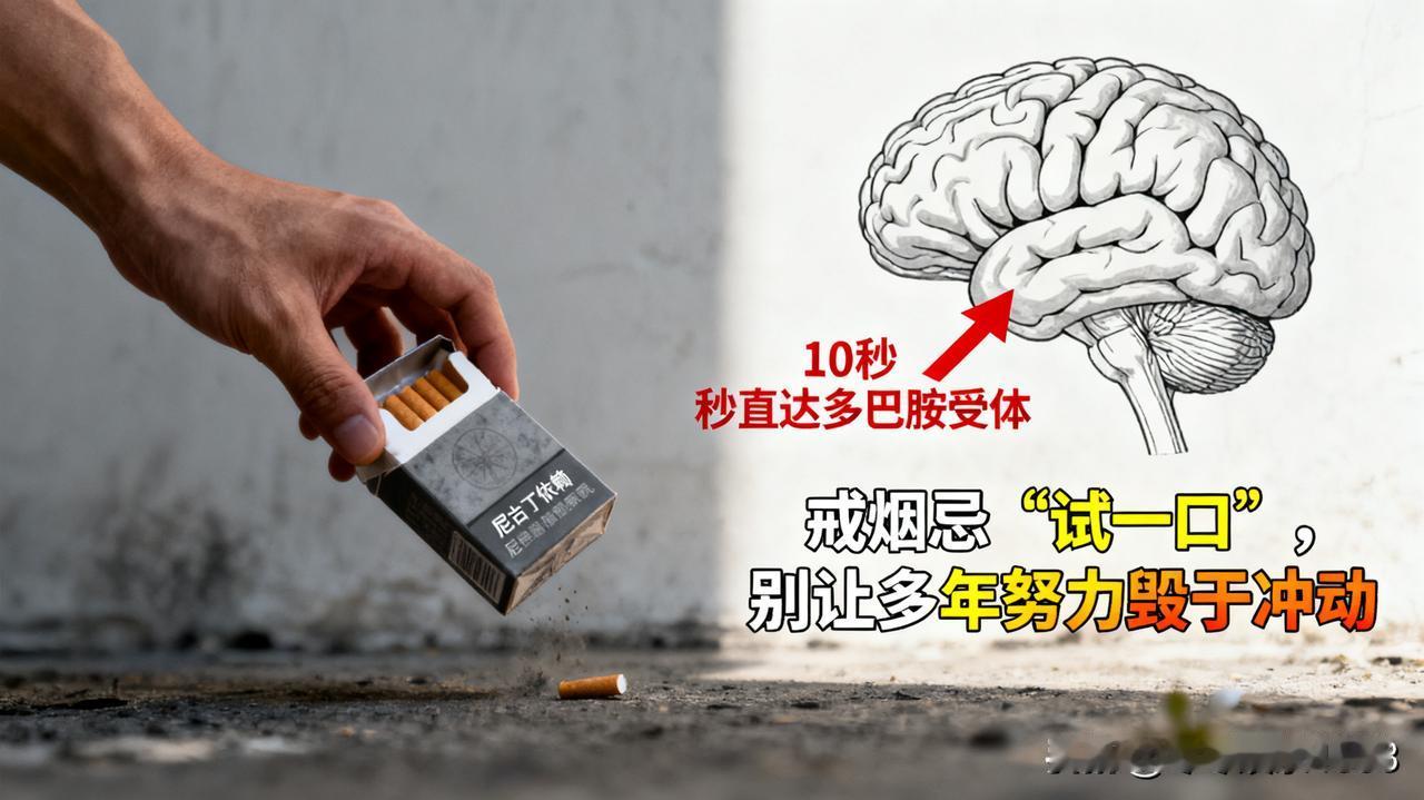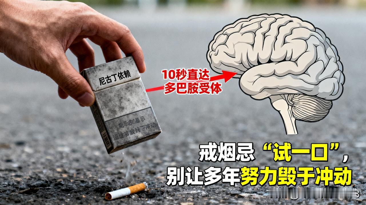 别让多年努力,毁在一时冲动啊!戒烟 12 年、彻底断烟 4 年,我曾笃定这辈子不会再碰烟 —— 直到上周那支 “好奇” 的烟,彻底打破了平静。 那天加班到深夜,莫名冒出来抽烟的念头,纠结半小时还是买了一支。刚抽两口,熟悉的晕感混着点 “放松” 涌上来,可放下烟就开始慌:手痒、坐不住,总想着再来一支。结果一周不到,一盒烟见底,看着空烟盒我懵了:这不是复吸,是尼古丁又 “缠” 上我了! 后来查资料才懂:尼古丁太狡猾 —— 吸进去 10 秒直达大脑,死死绑住多巴胺受体(大脑的快乐开关)。哪怕戒了几年,只要碰一次,那些 “休眠” 的受体立马被激活,身体瞬间记起依赖的感觉,想再断?难如登天!现在我把烟扔了,也想提醒大家:戒烟最忌 “试一口”,尼古丁的依赖,比你想的狠多了!