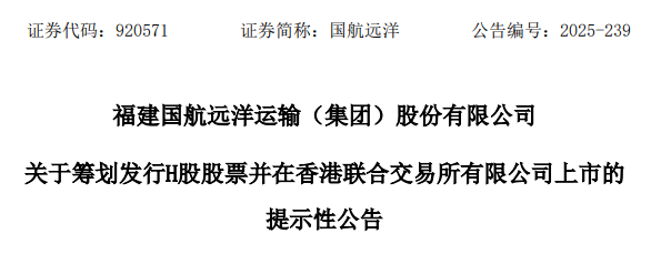 来自福建福州的A股上市公司国航远洋(920571.BJ)发布公告称,为锚定国际化战略发展,构建公司“绿色数智化”的远洋运力规模,增强新能源船舶技术引领优势,深度融入“走向深蓝”海洋强国战略,精准对接国家“十五五”规划中绿色航运、交通强国建设的核心要求,提升公司国际品牌知名度,满足发展中的融资需求,公司依据总体发展战略及经营规划,正在筹划境外发行股份(H股)并在港交所挂牌上市的相关工作。