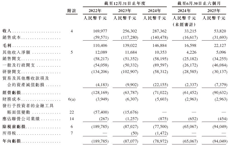 招股书显示,在过去的2022年、2023年、2024年和2025年前六个月,五一视界的收入分别为人民币1.70亿、2.56亿、2.87亿和0.54亿元,相应期间的净亏损分别为人民币1.90亿、0.87亿、0.79亿和0.94亿元。