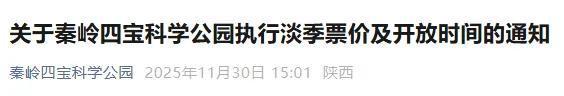自2025年12月1日起,秦岭四宝科学公园开始执行淡季票价及开放时间。现将具体事宜通知如下: