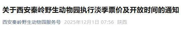 自2025年12月1日起,西安秦岭野生动物园开始执行淡季票价及开放时间。现将具体事宜通知如下: