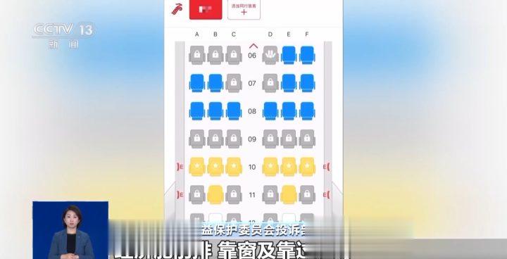江苏省消费者权益保护委员会投诉部工作人员张延菲:我们调查发现10家航空公司锁座范围高度集中于经济舱前排,靠窗及靠过道等消费者偏好的优质座位,仅开放中间区域,机尾等舒适度较差的座位供免费选择,限缩了消费者的选择权。