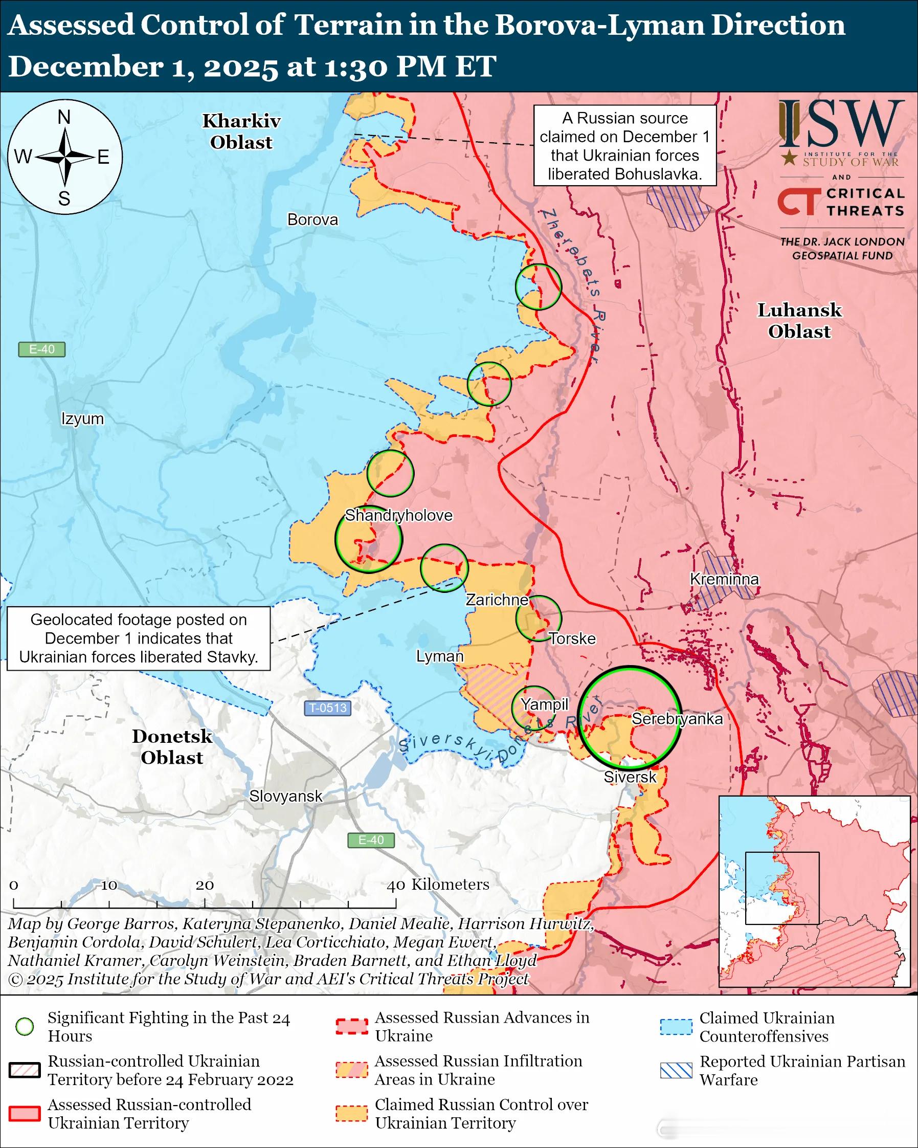 俄军主要行动2俄军目标:占领卢甘斯克州剩余部分,向西推进至哈尔科夫州东部,并包围顿涅茨克州北部。乌克兰军队在库皮扬斯克方向保持阵地并取得进展。俄罗斯声称占领的区域范围:12 月 1 日发布的地理定位视频显示,乌克兰军队在库里利夫卡北部(库皮扬斯克东南部)保持阵地并取得进展,而俄方此前声称俄军在该地区驻扎。11 月 30 日和 12 月 1 日,俄军在库皮扬斯克东北部的诺沃瓦西利夫卡附近、库皮扬斯克东部的彼得罗巴甫利夫卡附近以及库皮扬斯克东南部的皮什恰内和格卢什基夫卡附近发动了进攻。乌克兰联合部队特遣部队发言人维克托·特列胡博夫上校表示,库皮扬斯克方向的俄军继续使用小股渗透战术。特列胡博夫驳斥了克里姆林宫关于俄军已于2025年10月占领库皮扬斯克的说法。据报道一名隶属于俄第68摩步师(列宁格勒军区第6集团军)的俄罗斯军人于12月1日抱怨说,乌克兰的(FPV)无人机阻碍了俄军在库皮扬斯克的行动。乌克兰军队在博罗瓦方向保持阵地并取得了进展。俄罗斯声称占领的区域:一位与克里姆林宫有关联的俄罗斯军事博主于 11 月 30 日暗示,乌克兰军队在博胡斯拉夫卡(博罗瓦以北)保持着阵地,而俄方此前声称俄军在该地区保持着存在。未经证实的说法:一位俄罗斯军事博主声称,俄军已向博里夫斯卡安德里夫卡(博罗瓦东北部)以北推进。俄军攻击了新普拉托尼夫卡附近的博罗瓦以北;博罗瓦以东,前往 Shyikivka 和 Novoyehorivka;在博罗瓦东南部靠近 Druzhelyubivka 和 Tverdokhlibove 以及前往 Cherneshchyna 的方向。乌克兰军队最近向斯拉维扬斯克-莱曼方向推进。评估乌克兰的进展:12 月 1 日发布的地理定位视频显示,一名乌克兰军人在斯塔夫基北部升起了乌克兰国旗,这表明乌克兰军队解放了斯塔夫基(莱曼以北)。未经证实的说法:一位俄罗斯军事博主声称,俄军向莱曼以东以及迪布罗瓦(莱曼以南)的北部和东部推进。另一位俄罗斯军事博主声称,俄军切断了通往亚罗瓦(莱曼西北部)的铁路,并抵达了西维尔斯基顿涅茨河(亚罗瓦以南)河岸。然而另一位军事博主声称,俄军并未切断位于亚罗瓦铁路以南的C051018德罗比舍韦-亚罗瓦-斯维亚托希尔斯克公路。11月30日和12月1日,俄军在莱曼附近、莱曼西北部的卡尔皮夫卡、谢列德涅、尚德里霍洛韦、新谢利夫卡、德罗比舍韦和科罗维亚尔附近、莱曼北部的斯塔夫基附近、莱曼东部的扎里奇涅和托尔斯克附近以及莱曼东南部的扬皮尔附近发动了进攻。俄罗斯军事博客作者声称,乌克兰军队在莱曼东北部和斯塔夫基附近进行了反击。乌克兰第三军于12月1日驳斥了俄罗斯国防部和俄第20集团军(莫斯科军区)指挥部关于俄军占领斯塔夫基和新谢利夫卡的说法。该军指出,一些小股俄军正在渗透到俄军未控制的居民点,拍摄带有俄罗斯国旗的摆拍视频,以谎称俄军取得了进展。第三军报告称,乌克兰军队摧毁了这些小股俄军,而且俄军无法巩固阵地。在莱曼方向作战的乌军旅发言人表示,俄军仍在继续使用小股渗透战术,并试图扩大争议的“灰色地带”。该发言人还表示,俄军在兵力上对乌克兰军队拥有优势,兵力比约为1:6或1:10。发言人指出,许多俄军人员训练不足,但那些在破坏和侦察小组中活动的人员训练有素。斯拉维扬斯克市军事管理局局长瓦迪姆·利亚赫报告称,俄军于 11 月 30 日夜间至 12 月 1 日凌晨,用一枚制导滑翔炸弹和三架 Geran-2 无人机袭击了斯拉维扬斯克。战斗序列:据报道俄第164摩步旅(中央军区第25集团军)正在斯拉维扬斯克打击乌克兰军队。俄第16特种部队旅(俄罗斯总参谋部情报总局)和第144摩步师(中央军区第20集团军)的无人机操作员正在莱曼方向打击乌克兰阵地。