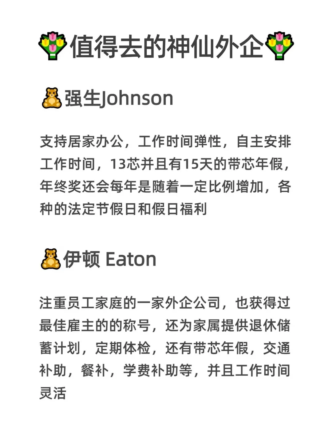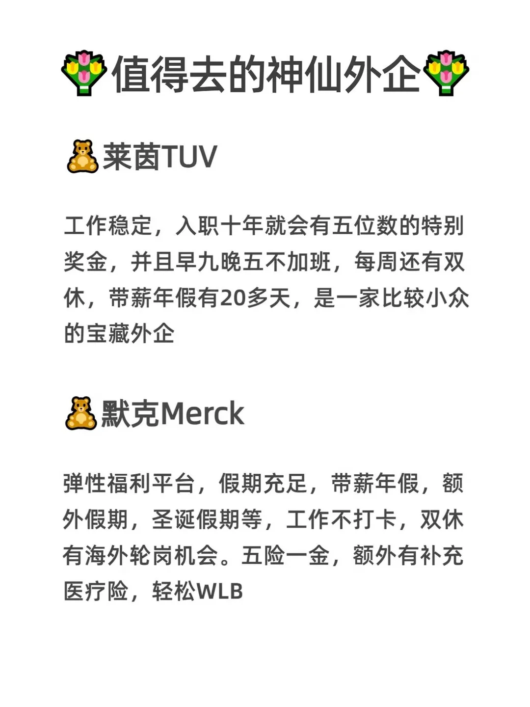 上海作为国际化魔都,[偷笑R]向来是外企的必争之地!今天就给大家盘点一波近期正在热招的上海神仙外企,别错过~ ~ 为什么找工作优先冲上海外企?[皱眉R] ✅包容度拉满,职场环境公平,女性晋升通道清晰[微笑R] ✅年假标配12天起,连带薪病假都给得大方 ✅弹性办公,补充医疗、年度体检等福利直接拉满[斜眼R] ~ 我整理好了外企的信息表,帮助宝子们消除信息差 ~