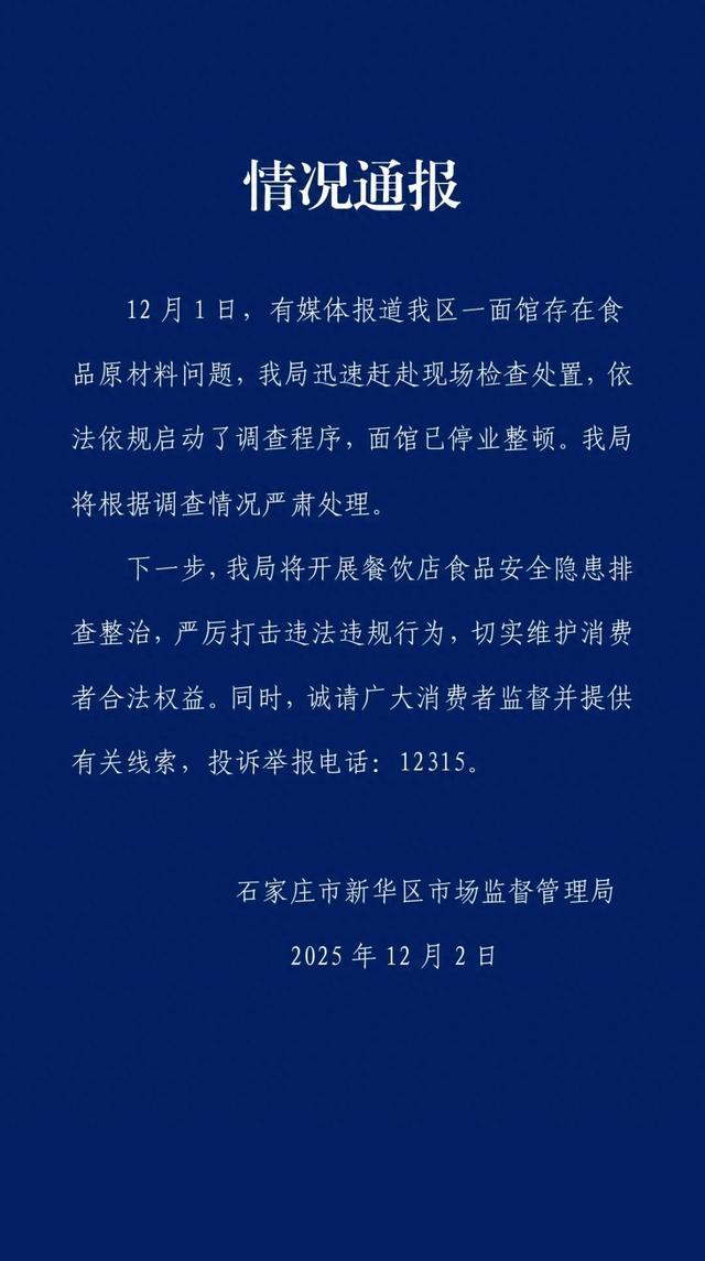 12月1日,有媒体报道我区一面馆存在食品原材料问题,我局迅速赶赴现场检查处置,依法依规启动了调查程序,面馆已停业整顿。我局将根据调查情况严肃处理。