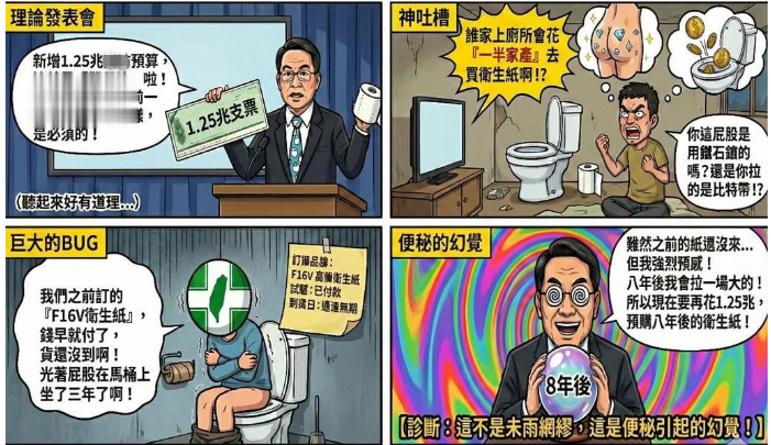 侯汉廷表示,民进党说,虽然之前的纸还没来,但预感8年后会“拉一场大的”,所以现在要再花新台币1.25万亿元,预购8年后的“卫生纸”。这不是未雨绸缪,这是“便秘”引起的“幻觉”。过去买的东西没到货,正常人是“催货”,民进党却选择继续“砸钱”,美其名“深化台美关系”,这哪是深化关系,这是“深化债务”。