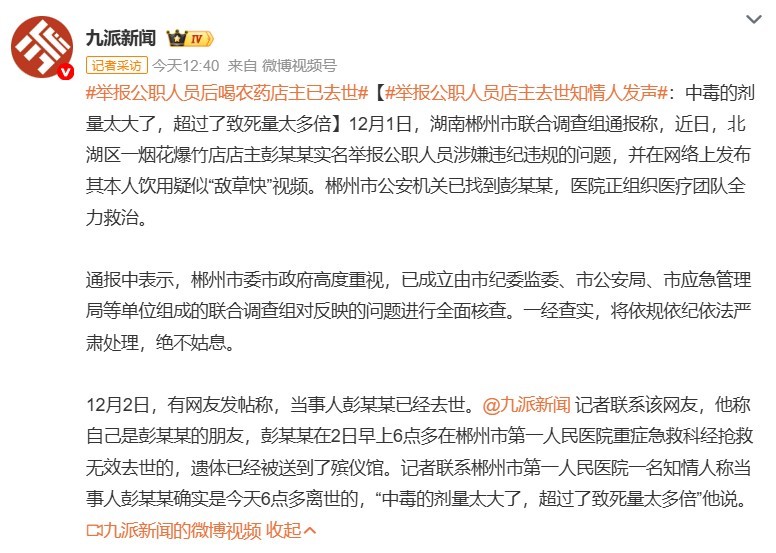 举报公职人员后喝农药店主已去世 智搜有个重要情节:他在网上发布举报信当日,其店铺