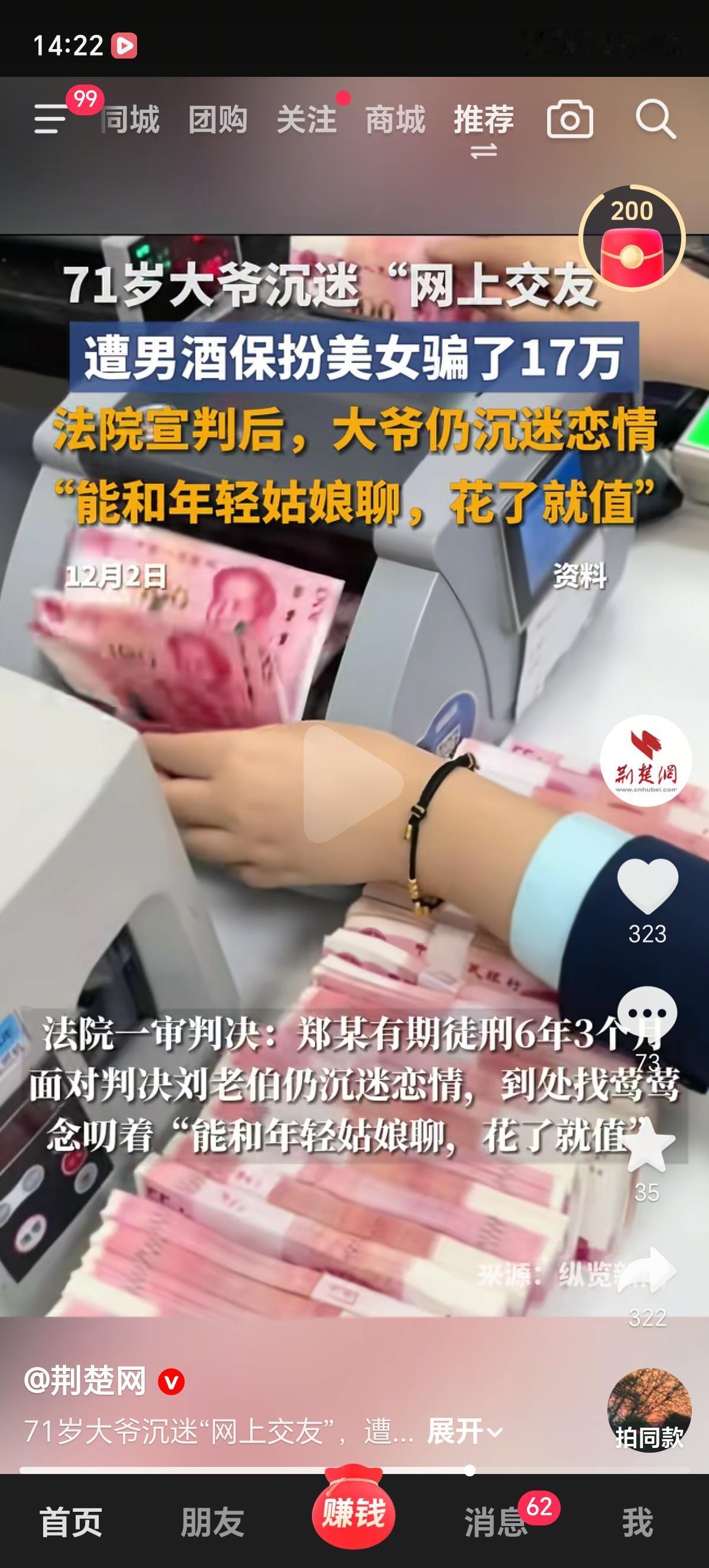 上海71岁刘老伯每天跟年轻姑娘聊天,给17万投资姑娘,没想到对方是个“捞男”,更没想到会遇到“仙人跳”。 刘老伯退休后闲得慌,天天泡在交友软件上,账号有2000多个女性点赞,这让他特别自豪,就爱跟年轻姑娘聊天。2024年初,他刷到了一个叫“莺莺”的账号,头像年轻漂亮,说话温柔还会写情诗,一口一个“老伯你有文化”,把刘老伯哄得五迷三道。没聊多久,“莺莺”就开始找借口要钱,买化妆品、买衣服,后来又说要投资,刘老伯二话不说就转了17万,觉得“年轻姑娘愿意陪我聊,花点钱咋了”。 可他不知道,屏幕那头的“清纯美女”,其实是酒吧里的男酒保郑某。郑某在酒吧见多了男人为女人砸钱的场面,自己又急着凑钱在上海买房当彩礼,就动了歪心思,专门男扮女装骗老人。等刘老伯提出见面,郑某还找了酒吧的驻唱女冒充“莺莺”赴约,见面地点选在人多灯暗的酒吧,刘老伯花了1580元酒水钱,还额外给郑某转了380元“服务费”,全程没发现破绽。 可他不知道,屏幕那头的“清纯美女”,其实是酒吧里的男酒保郑某。郑某在酒吧见多了男人为女人砸钱的场面,自己又急着凑钱在上海买房当彩礼,就动了歪心思,专门男扮女装骗老人。等刘老伯提出见面,郑某还找了酒吧的驻唱女冒充“莺莺”赴约,见面地点选在人多灯暗的酒吧,刘老伯花了1580元酒水钱,还额外给郑某转了380元“服务费”,全程没发现破绽。 后来郑某贪念越来越大,直接用“莺莺”的名义把刘老伯约到公园,自己扮成“莺莺前男友”,掏出裹着伞套的刀威胁他转账。71岁的老人被吓得倒地擦伤,不仅转了手机里的钱,还被带到酒店逼着想女儿要钱,幸好女儿识破骗局及时报警,郑某才被抓。 后来郑某贪念越来越大,直接用“莺莺”的名义把刘老伯约到公园,自己扮成“莺莺前男友”,掏出裹着伞套的刀威胁他转账。71岁的老人被吓得倒地擦伤,不仅转了手机里的钱,还被带到酒店逼着想女儿要钱,幸好女儿识破骗局及时报警,郑某才被抓。 法院最后判了郑某6年3个月有期徒刑,可刘老伯到现在还没醒过神,坚持说“我见过莺莺本人,肯定是郑某抢了她手机”。更离谱的是,这已经不是他第一次被骗,之前被假“创业美女”骗钱,找私家侦探和“讨债律师”追损时又被骗,却还嘴硬“钱生不带来死不带去,能和年轻姑娘聊,花了就值”。 刘老伯,退休前是高级工程师,智商很高,退休金不少。男人无论多大年龄,爱美女真是常态啊,这是心甘情愿坠入“网恋”的爱河。大概是太孤单了吧。