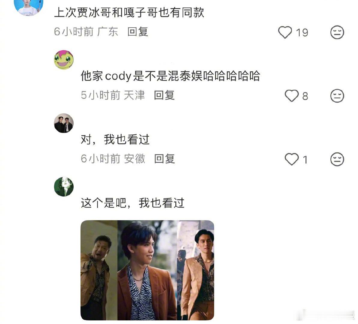 贾冰和吉米撞衫怀疑贾冰的造型师是混泰娱的 有网友发现贾冰和泰星吉米撞衫了,然后有网友说这其实不是贾冰第一次和泰星撞衫了合理怀疑怀疑贾冰的造型师是混泰娱的吧?