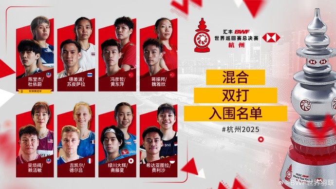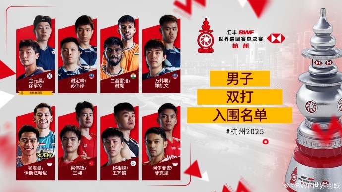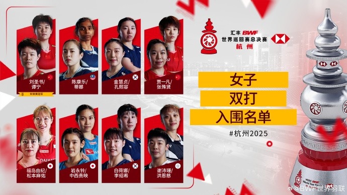 国羽除男双项目以外,全部满额参赛。本次总决赛将在杭州进行,小组赛抽签仪式将于当地时间12月13日上午10点30分在杭州举行。