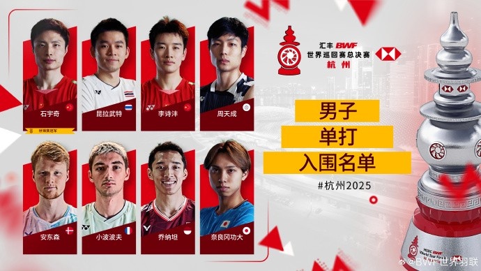 直播吧12月2日讯世界羽联世界巡回赛总决赛参赛名单确定,石宇奇领衔男单,安洗莹领衔女单。