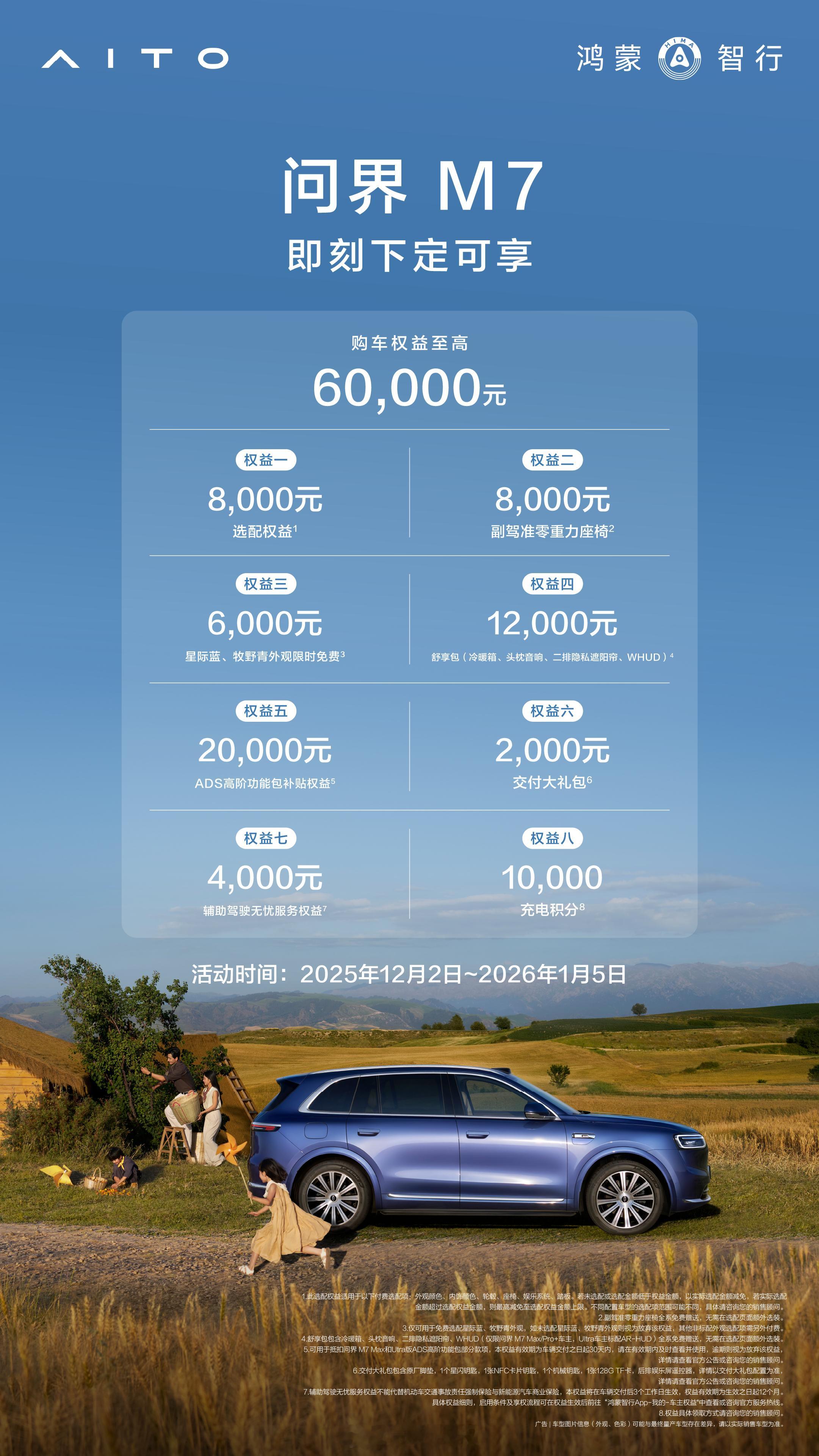 毫无疑问,问界就是中国汽车第一豪华品牌你看现在这势头多么强劲。全新问界M7上市68天,交付量突破40000台。所以,那么多豪车用户宁愿卖掉自己的BBA也要换问界,用真金白银的行动去投票,就知道是多厉害的事情。前阵子我的问界M8回店首保,我也特意看了一下这台车。产品力可以说是全维度升级和蜕变,能够引领30-35万级的SUV市场是有道理的。而且目前购车至2026年1月5日下定,还可以享受至高60000元购车权益。欲购从速啊,现在趁着离春节还有点时间,起码可以在过年前赶上提车回家。全新问界M7上市68天交付破4万台全新问界M7累计交付超4万台 广州
