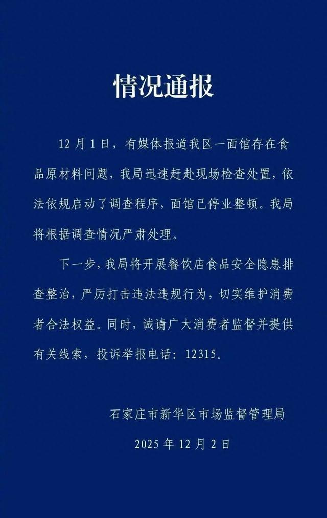 12月2日,石家庄市新华区市场监督管理局发布情况通报:12月1日,有媒体报道我区一面馆存在食品原材料问题,我局迅速赶赴现场检查处置,依法依规启动了调查程序,面馆已停业整顿。我局将根据调查情况严肃处理。