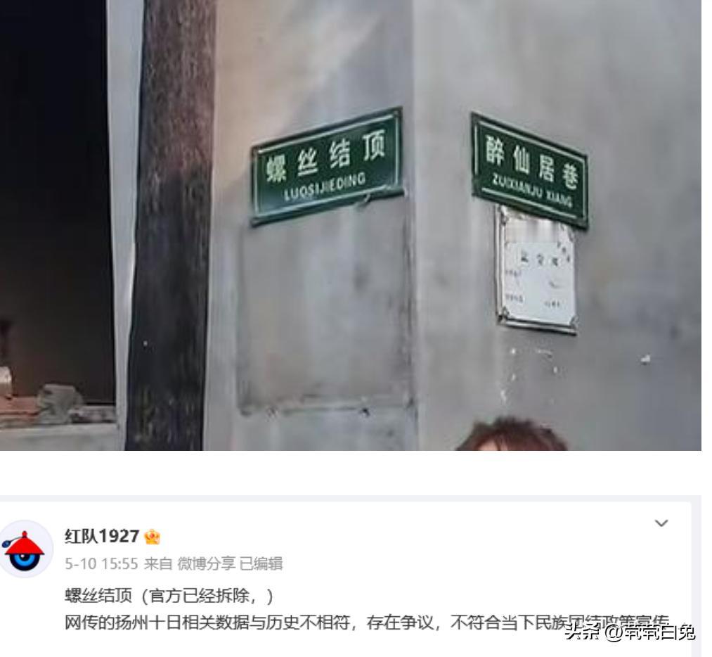 由于满遗宋剑仁的投诉,纪念扬州十日的螺丝结顶牌子被拆。
