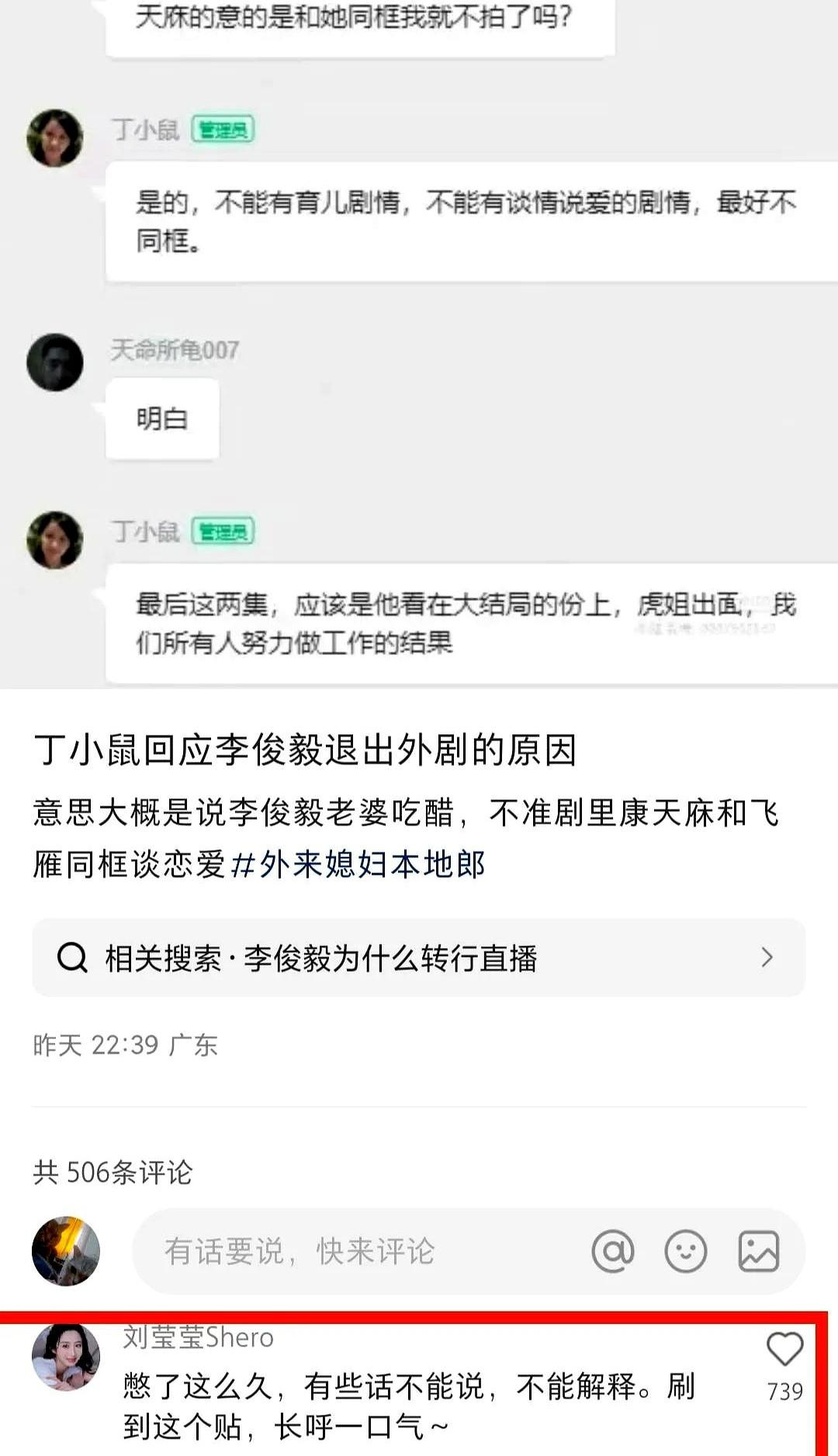居然跟他妻子有关。 编剧丁小鼠在粉丝群里直接放料,说李俊毅不拍了,原因是他结了婚,不想再拍那些谈情说爱、带娃的戏,怕跟自己生活搞混。演罗飞雁的刘莹莹还在评论区默认了这事。 可李俊毅自己不认,发文说“老婆比较大方”,根本不是这回事。后来俩人还搞了个直播对线,李俊毅直接点名“另外那位”,说有些事都影响到家人和健康了,气氛很僵,一边都哭了。 这事没那么简单。这剧组早就有过矛盾,因为合同和集数问题,演康祈祖的徐若琪都带头走过一批人。李俊毅自己从8岁演到32岁,早就想换个跑道发展发展,不想一辈子就一个康天庥。 现在剧组已经重新开拍,85岁的康婶都回来撑场子。康天庥和康祈耀是真的没影了,这下算彻底确认离队。