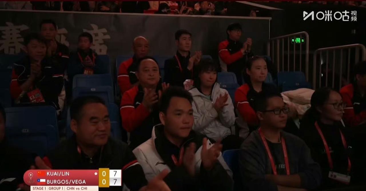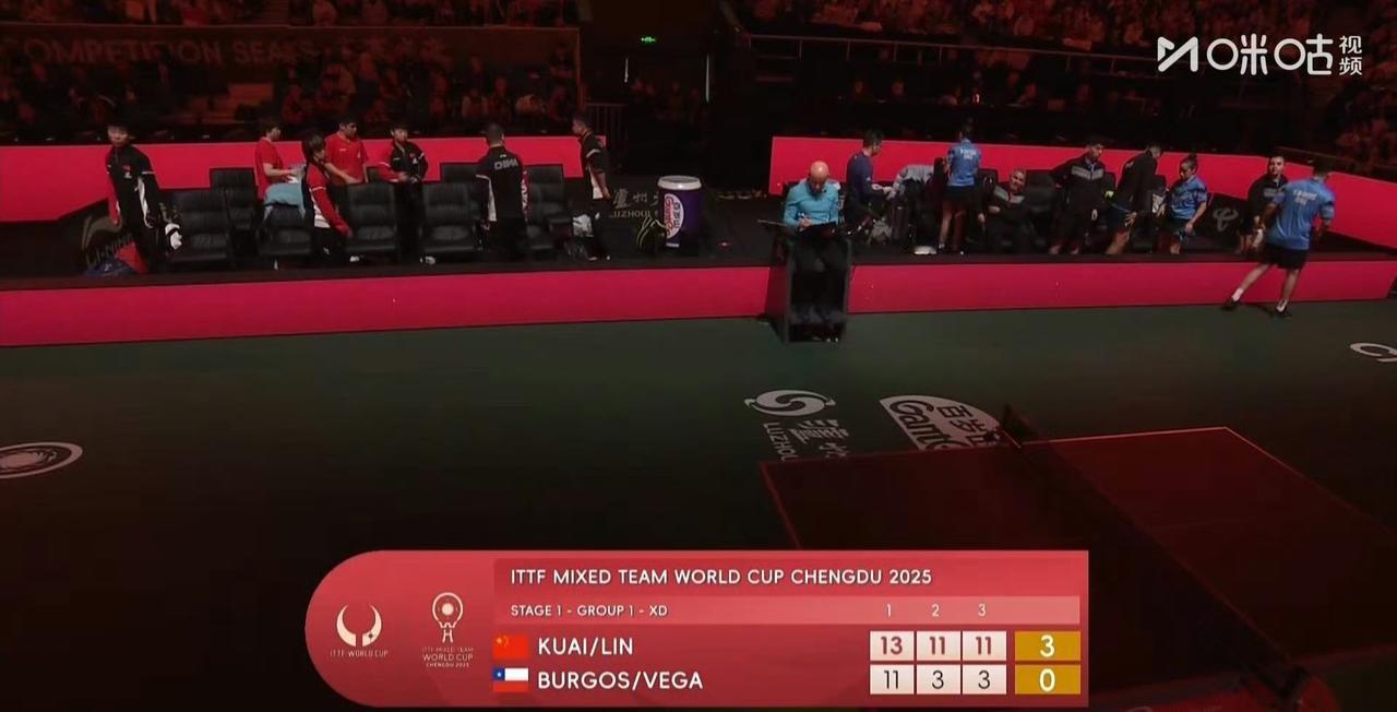 第一盘林诗栋/蒯曼3-0拿下[赞][笑哭]! 三局比分为栋曼组合13-11,11-3,11-3胜了博格斯/维加! 这是2025成都国际乒联混团世界杯小组赛,第一组,🇨🇳中国队🆚智利队🇨🇱的比赛。 看台上肖战指导和王励勤领导并排坐着,旁边还坐着我们几个陪练选手。 看台上还有个大哥在选手发球时还在大声呼喊“我爱你”,挺离谱的[捂脸]。 第二盘女单比赛王曼昱将会出战,第三盘男单比赛梁靖崑出战。 按照中国队以往的阵容排布惯例,这一场王艺迪和徐瑛彬还是不会上了。 这一场结束后,第一阶段比赛就也结束了。第二阶段大迪和徐瑛彬会不会上场不得而知,不过能看出来国乒教练组就是想锻炼主力选手,对于非主力选手就是暂且休息。