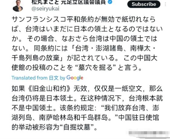 日本前议员松丸诚撂话,中国若不接受旧金山和约,那台湾就是日本“领土”!12月1日,松丸诚刊文声称,若《旧金山和约》无效、不过是一张废纸,那台湾不就依然是日本的“领土”了吗?倘若如此,台湾就“更不可能”是中国的领土了。该条约中明确记载着“放弃台湾、澎湖列岛、南库页岛及千岛群岛”。中国大使馆的相关发文,简直是“自掘坟墓”。 要拆解这个问题,得先回到历史现场。《旧金山和约》是1951年由美国主导、部分盟国与日本签订的条约,但关键是中国从头到尾都没被邀请参会,更别说签字了。 一个连当事国都不在场的协议,却想决定其领土归属,这本身就像一场缺席审判,合法性从根子上就站不住脚。 而且中国外交部早就明确表态,这份和约违反了1942年《联合国家宣言》里禁止与敌国单独媾和的规定,也违背了《联合国宪章》的基本原则,中方从来就没接受过,它对台湾主权的任何处置,从根子上就是非法无效的。 要理清台湾的归属,得把时间线捋清楚。台湾自古就是中国的领土,从三国时期孙权派卫温抵达夷洲,到宋元时期纳入中央行政管辖,再到明清设府治理,千百年里从未改变。 1895年清政府在甲午战争中落败,被迫签下《马关条约》,台湾才被日本窃取,这是历史上的屈辱,但绝不代表日本对台湾拥有合法主权。 1943年,中美英三国在开罗召开会议,发表的《开罗宣言》白纸黑字写着,要把日本从中国窃取的所有领土,包括东北、台湾、澎湖列岛等,全部归还中国,这是第一次从国际法层面明确了台湾的归属。 1945年的《波茨坦公告》又再次重申,《开罗宣言》的条件必须实施,而日本在投降书中也明确承诺,会忠诚履行《波茨坦公告》的所有规定。 1945年10月25日,日本最后一任台湾总督安藤利吉签署文件,台湾正式回归中国管辖,这一天也被定为“台湾光复节”,是全体中国人都该记得的日子。 松丸诚绝口不提这些铁证,只揪着《旧金山和约》里“日本放弃台湾”的半句文字做文章,却故意回避“放弃后归谁”的核心问题,无非是想制造“台湾地位未定”的假象,这种断章取义的把戏,骗骗不懂历史的人还行,在铁证面前根本站不住脚。 最讽刺的是,松丸诚作为日本前议员,连本国政府的正式承诺都视而不见。 1972年中日邦交正常化时,双方签署的《中日联合声明》里,日本政府明确承认中华人民共和国政府是中国的唯一合法政府,充分理解并尊重中国关于“台湾是中国领土不可分割的一部分”的立场,还承诺坚持遵循《波茨坦公告》第八条。 1978年的《中日和平友好条约》,又再次确认了《中日联合声明》的所有原则,这是日本政府白纸黑字的承诺,具有国际法效力,松丸诚却跳出来唱反调。 说白了就是想靠炒作涉台议题刷存在感,这种违背本国政府立场的言论,在日本国内也站不住脚。 从国际社会的共识来看,1971年联合国第2758号决议以压倒性多数通过,恢复了中华人民共和国在联合国的一切合法权利,明确了世界上只有一个中国,中华人民共和国政府是代表全中国的唯一合法政府,这就从政治、法律和程序上彻底解决了包括台湾在内的中国在联合国的代表权问题。 联合国官方文件里,台湾的称谓一直是“台湾,中国的省”,联合国秘书处的法律意见也明确,台湾作为中国的一个省没有独立地位,台湾当局也不享有任何形式的政府地位。 如今全世界有183个国家在一个中国原则的基础上与中国建交,这意味着绝大多数国家都认可台湾是中国的一部分,松丸诚的言论,不仅违背历史和法理,更是与国际社会的普遍共识背道而驰。 松丸诚之流的这番叫嚣,本质上是想篡改二战后的国际秩序,挑战一个中国原则,但历史事实不会因为几句胡话就改变。 台湾回归中国是中国人民抗日战争胜利的重要成果,是用数千万同胞的生命和鲜血换来的,绝不是任何势力能随意篡改的。 这种言论也恰恰提醒我们,维护国家领土完整,既要靠硬实力说话,也要时刻警惕那些试图歪曲历史、篡改教科书的小动作,毕竟只有让更多人认清历史真相,才能让这类哗众取宠的言论彻底失去市场。