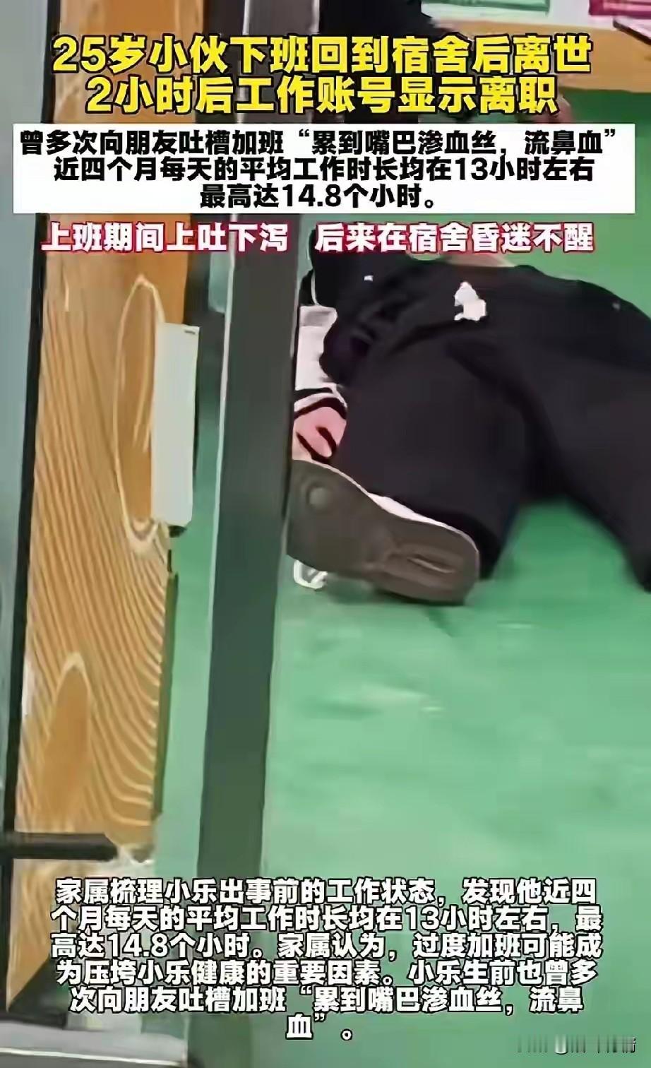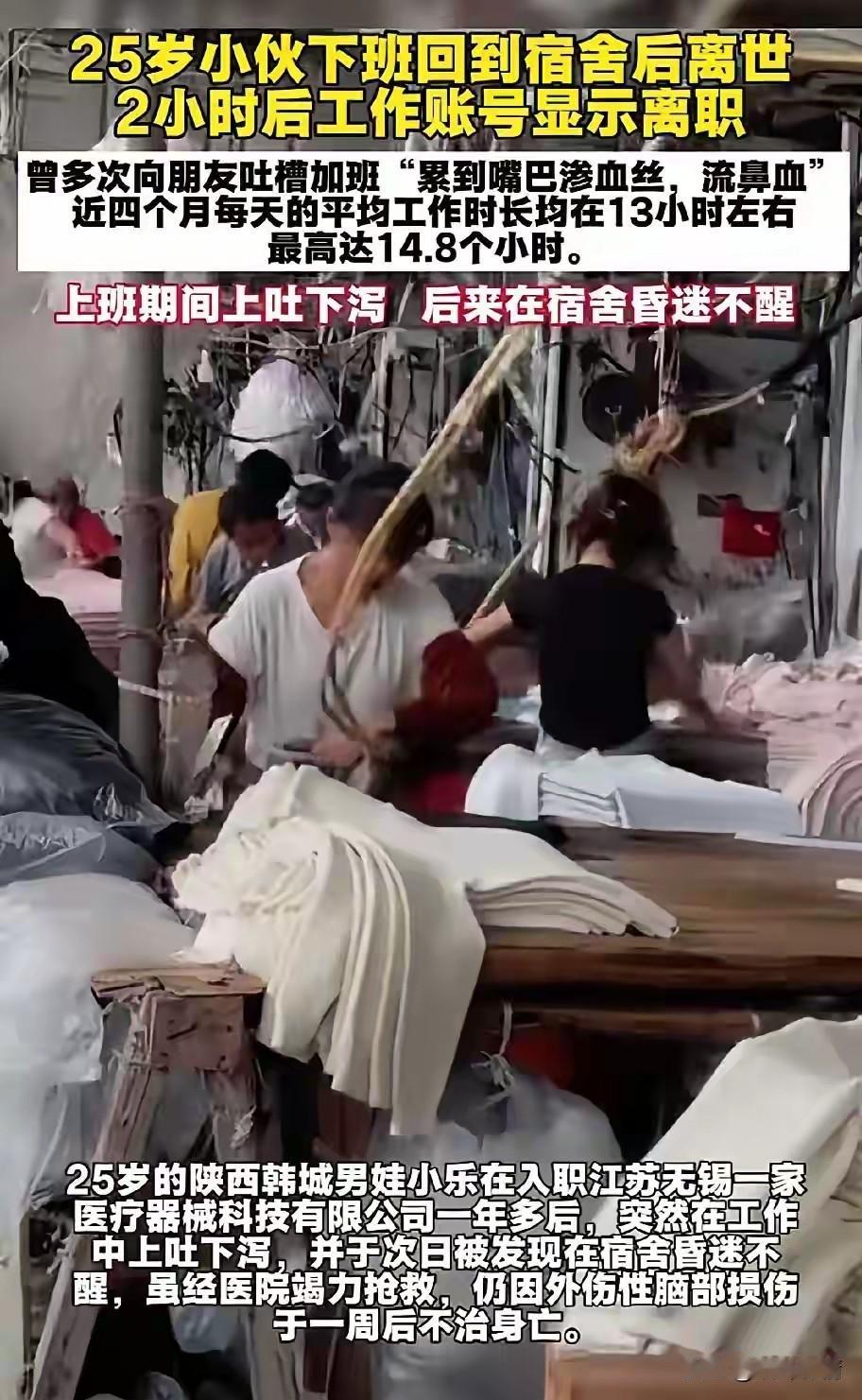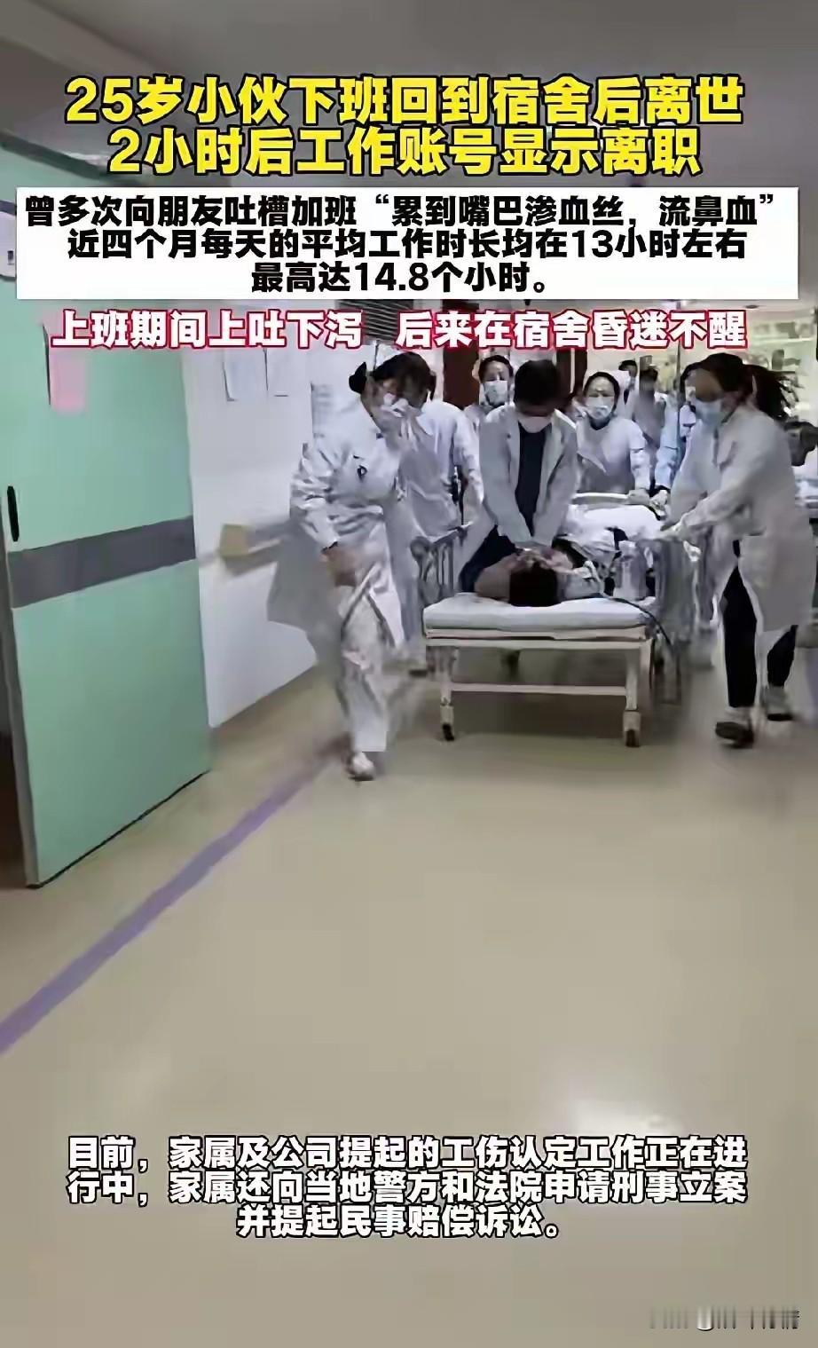 25岁陕西韩城小伙在江苏无锡一家医疗器械公司工作期间上吐下泻, 去世进4个月平均工作时长在13个小时左右,最高达14.8个小时, 这简直是不把人当人, 西方国家每天工作8小时, 工人们因为一周休息两天不满意而罢工,我国劳动者呢, 每天工作13小时左右, 每周一天休息都保证不了, 原来以为每天工作12小时就是极限, 现在已经普遍工作13个小时了, 这样工作下去不出事才怪, 有人肯定会说你可以不干, 不干吃什么, 这就是现实版的何不吃肉糜! 这小伙这么年纪轻轻都顶不住了, 最可气的是小伙子都在医院住院抢救了。公司居然把人家的工作账号显示离职,真是太过分了, 家属申请工伤赔偿, 并且要求刑事立案, 如果不限制资本家, 为了利润啥事都敢干, 大家对于江苏这家医疗器械公司这样做事怎么看? 青年猝死 下班后猝死 小伙发病死亡 工位猝死 工作意外死亡 医院离世