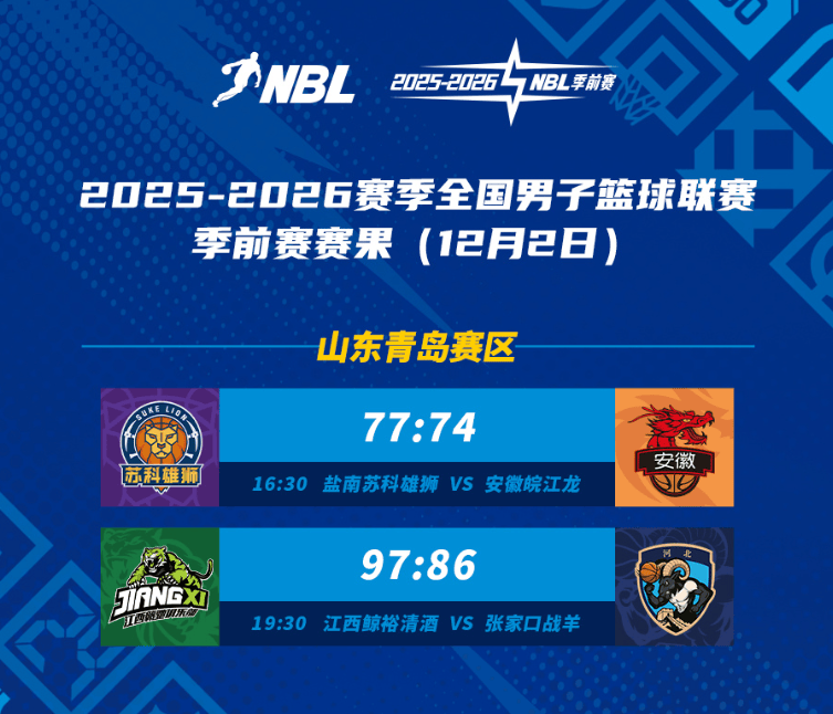 在山东青岛赛区进行的两场对阵中,盐南苏科雄狮77-74险胜安徽皖江龙,刘宇轩得到19分;江西鲸裕清酒97-86战胜张家口战羊,刘俊文砍下28分。