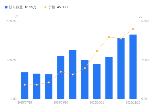 日期A股户数(户)流通A股户均持股数(股)户均持股市值(万元)2025-11-281655373026.1613.632025-11-201567983194.8212.422025-11-101081994629.8218.442025-10-31893605605.8917.292025-09-301004214988.429.842025-09-191264033963.066.252025-09-101107964521.307.932025-08-29633347909.538.442025-07-31650407702.067.072025-07-18683247331.866.71