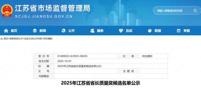 12月1日,江苏省质量发展委员会办公室发布“2025年江苏省省长质量奖候选名单公示”。