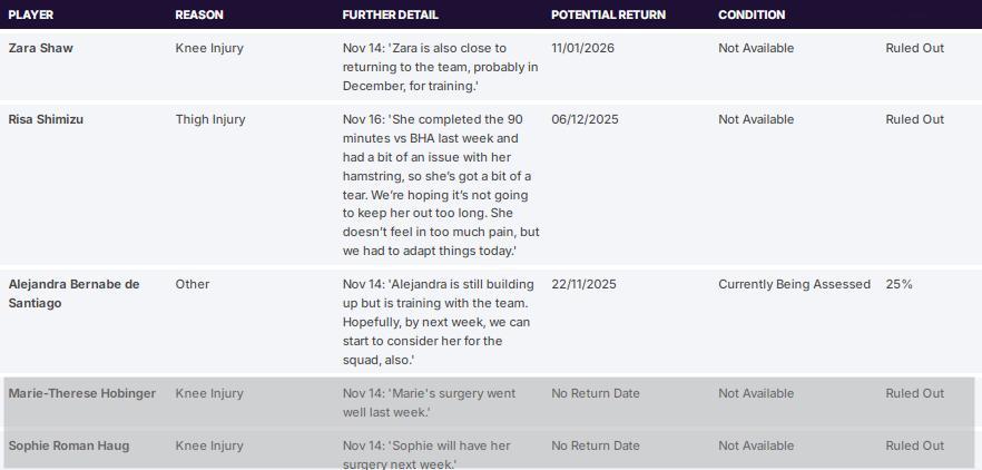 利物浦女足 泰勒在接受官网采访时表示:“看起来我们接下来10天将会缺少菲斯克,这对我们来说来得太不是时候了。这非常令人沮丧,而且由于清水梨纱仍在伤缺,我们的选择相当有限。露西·帕里将进入候选名单,但她目前的体能状况还不足以支撑踢满90分钟,所以我们得再看看右后卫位置上的最终安排。”