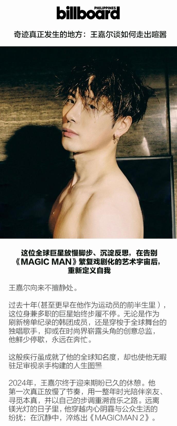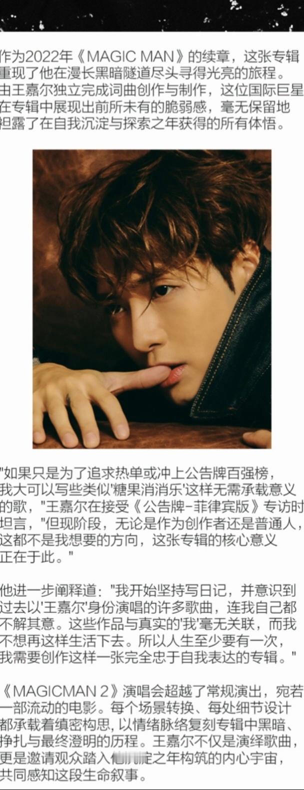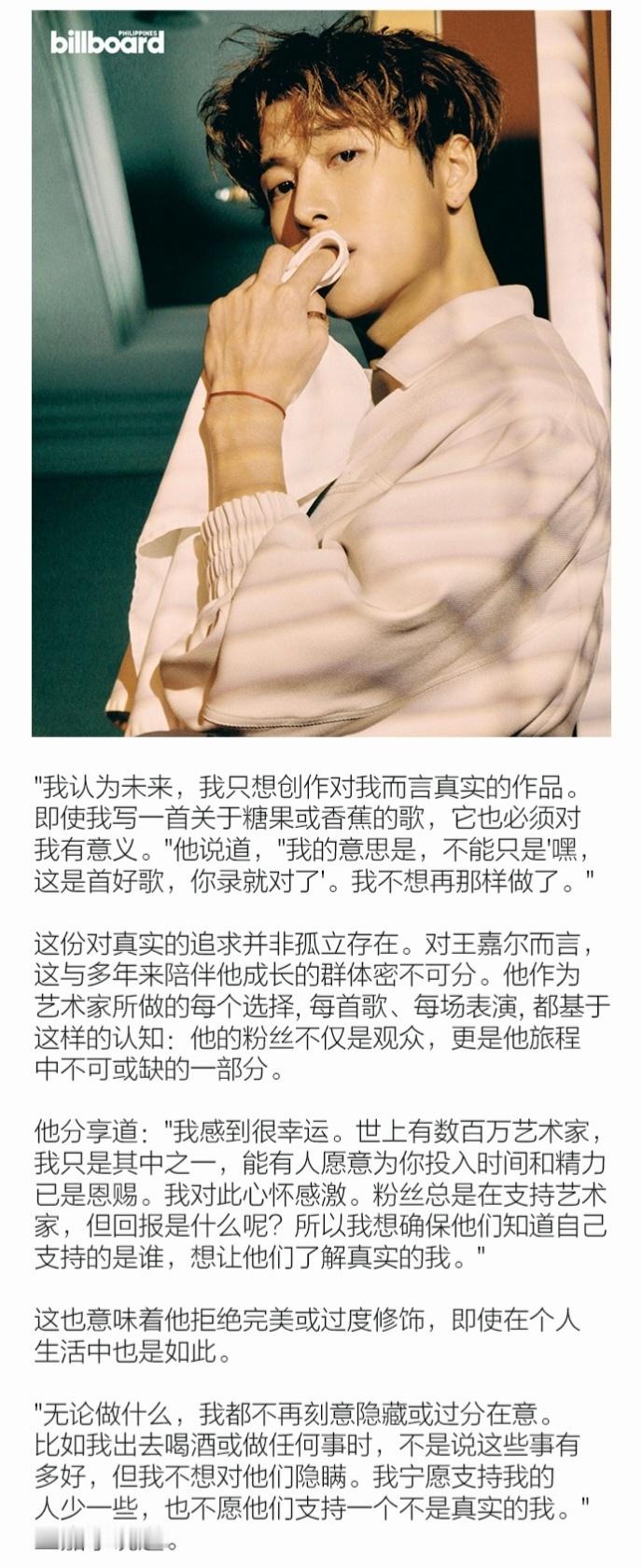 王嘉尔智性恋赛道没有对手新刊物的这段采访,谁看了不会陷入他的智性恋魅力?而且是那种越看越让人心安的类型:思路清晰、表达坦诚、情绪稳定,对自己和世界都有自己的独立判断。“人生中的好与坏,都有其存在的意义。无需逃避。好未必全好,坏未必全坏, 好坏本就相生相伴。所以生命中的一切,无论顺境逆境,接纳它,与之共处。最终极的启示是:所有过往与将来,塑造了今日独一无二的你。” 太会表达了,他那种会沟通、能共情、愿意分享想法的气质,真的会让人不自觉靠近,很自然地把真实的自己摊开在你面前。又有邻家哥哥的亲和,又有高智感引导型恋人的魅力。这次封面的造型也很好品,卷卷的头发、干净的长相、轻松慵懒的状态……,智性恋赛道还有谁是对手?