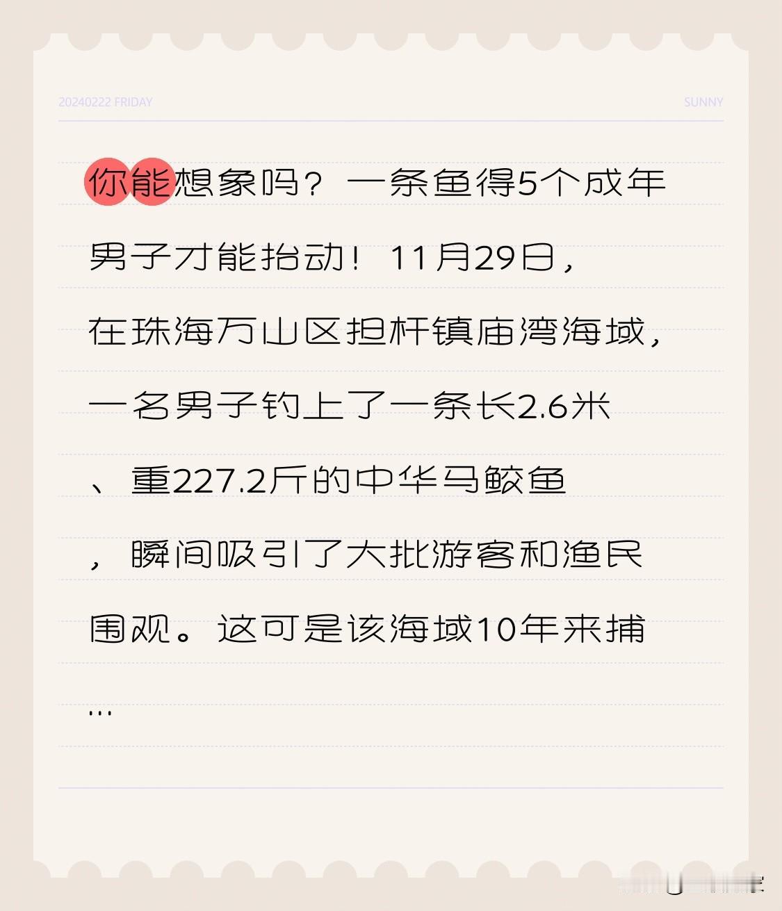 你能想象吗?一条鱼得5个成年男子才能抬动!11月29日,在珠海万山区担杆镇庙湾海域,一名男子钓上了一条长2.6米、重227.2斤的中华马鲛鱼,瞬间吸引了大批游客和渔民围观。这可是该海域10年来捕获的最大中华马鲛鱼,简直就是“鱼王”级别。 目前,这条“海中巨物”被放在担杆镇外伶仃岛的冷库里等待处置。中华马鲛在南海本就少见,这么大的更是罕见。大家都好奇,它是怎么长这么大的,为啥会出现在这里呢? 你觉得这条鱼王最后会如何处置?南海出现这么大的中华马鲛鱼是偶然吗?钓鱼界还会有更惊人的收获吗? 野钓巨鱼 三米长大鱼 鱼获巨物 巨无霸鱼王 高湖鱼王 贵州鱼王 海南马鲛鱼 天价马鲛鱼 南澳马鲛鱼 南马鲛鱼 象山马鲛鱼 香马鲛鱼 海南亿涛马鲛鱼