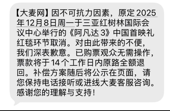 《阿凡达:火与烬》(《阿凡达3》)中国首映礼,原计划作为第七届海南岛国际电影节特别活动于12月8日在三亚举行,导演詹姆斯·卡梅隆也将惊喜现身。但有网友表示今日收到了红毯活动取消的邮件通知:“因不可抗力因素,我们非常遗憾地通知您:原定于2025年12月8日(周一)于海南三亚红树林国际会议中心举办的《阿凡达3》中国首映礼红毯环节决定取消。对于活动取消给您带来的不便,我们深表歉意,敬请谅解。”