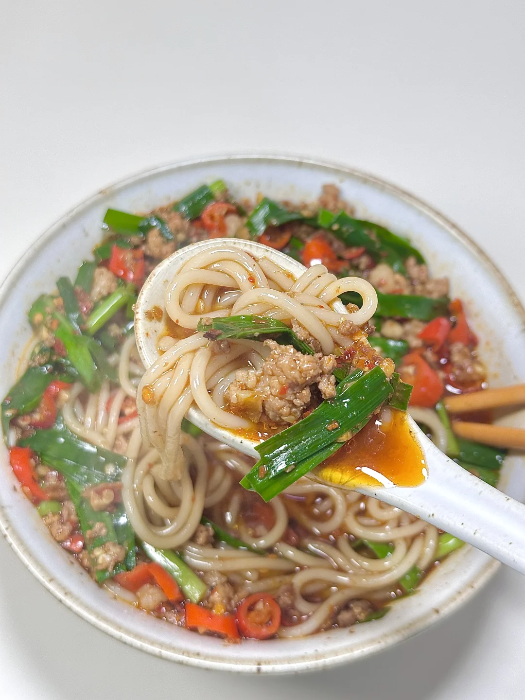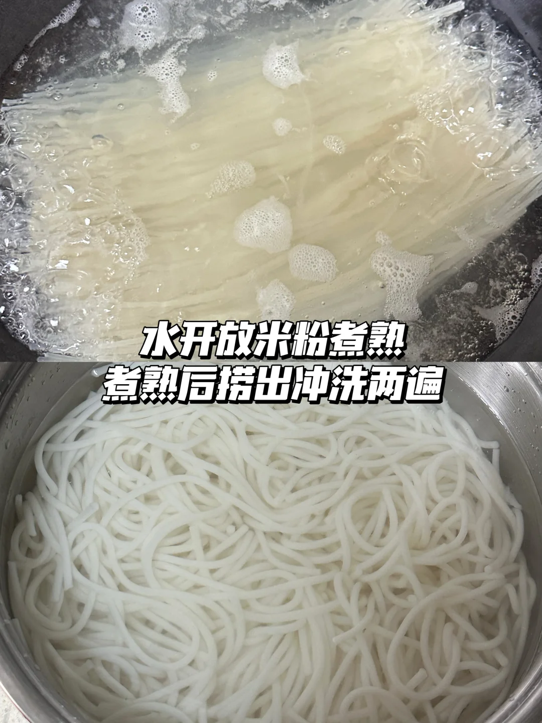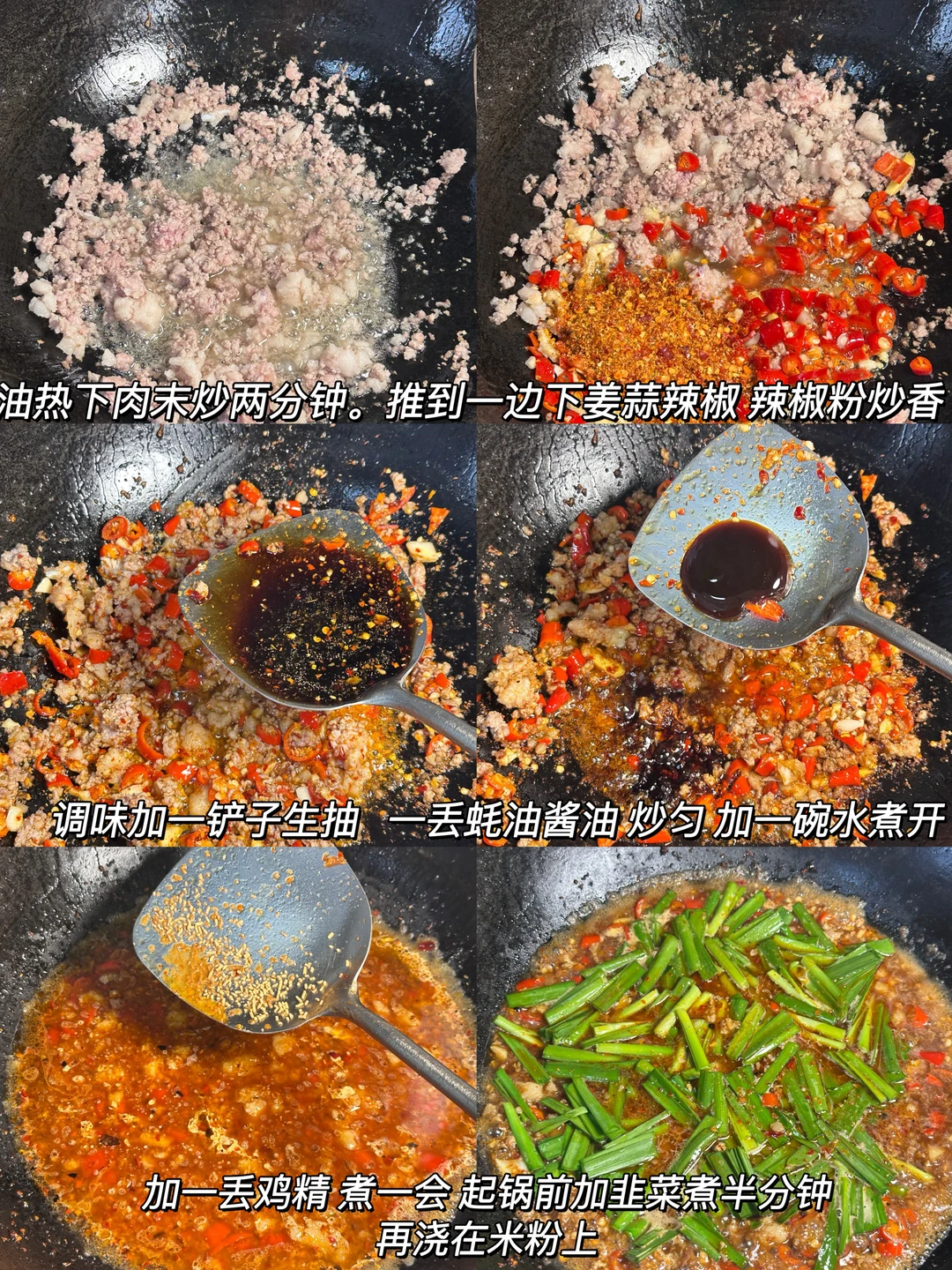 江西腌粉 天热不想做饭 来一碗 香香辣辣的 太好嗦了,吃不腻~的三餐四季 ✨食材:米粉 韭菜 肉沫 姜蒜末 小米椒 辣椒粉 1️⃣:锅里水烧开放米粉煮5分钟。盖盖泡20分钟左右,煮熟后捞出来冲洗两遍沥干水份备用。锅里倒油放肉沫炒两分钟,推到一边下姜蒜 辣椒 辣椒粉炒香炒出红油。 调味加一铲子生抽 一丢酱油,蚝油炒香。倒入一碗水煮开 加一丢鸡精中火煮一会,起锅前放韭菜 好好吃饭呀🖖🏻