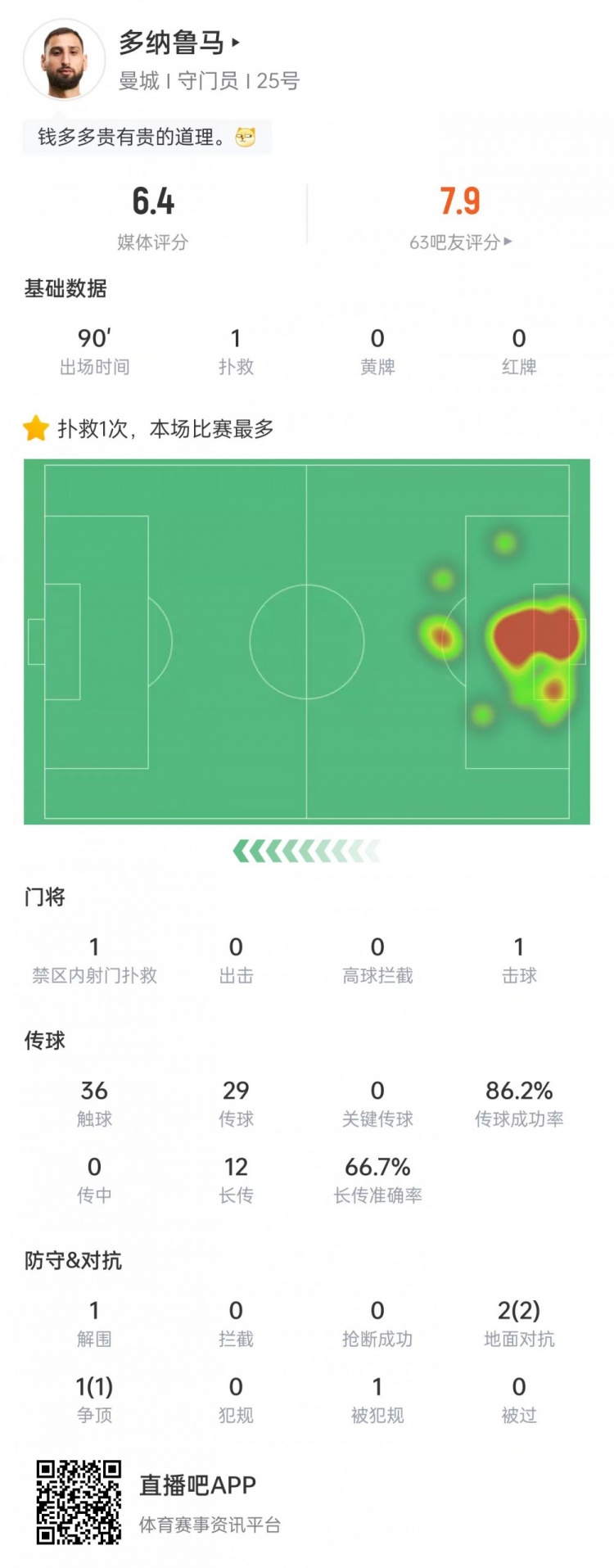 直播吧12月3日讯英超第14轮比赛,多纳鲁马全场仅做出1次扑救,曼城客场5-4击败富勒姆。
