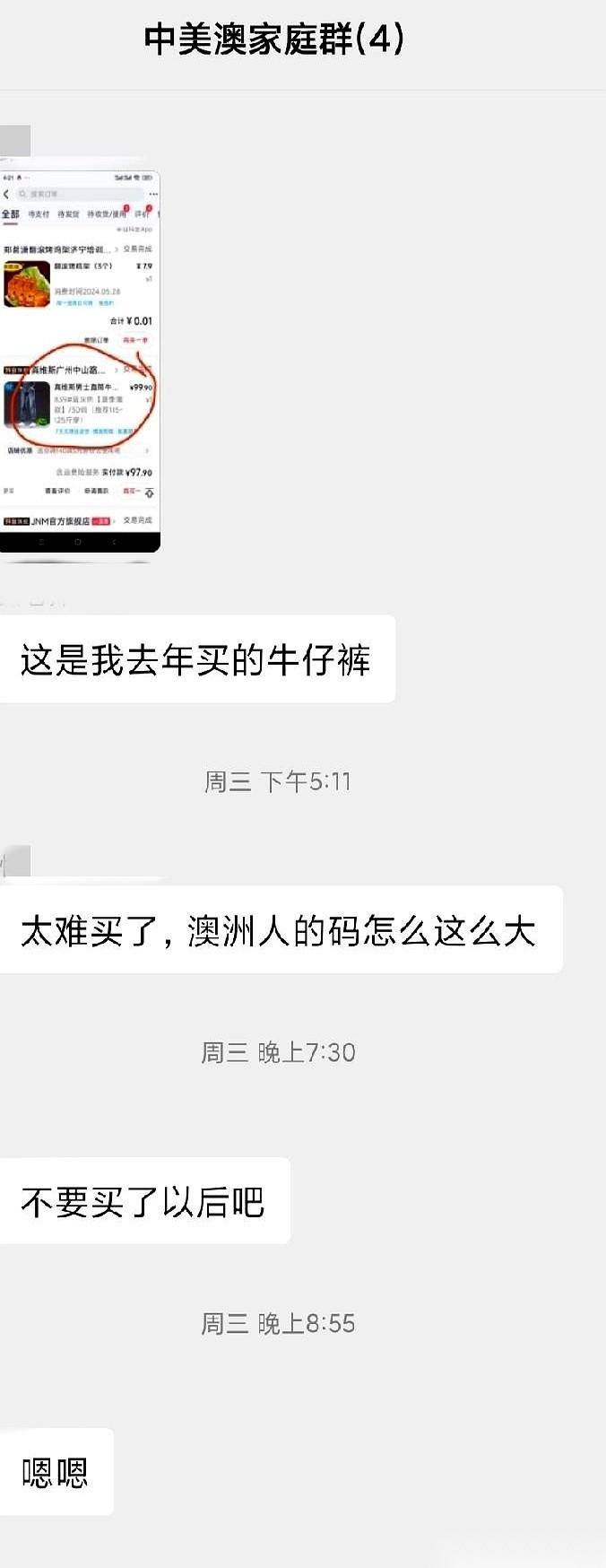 我那瘦成杆儿的大儿子,估计是澳洲牛仔裤店这辈子都无法理解的痛。 真的,让人哭笑不得。 胖二子在那边打工,赚了人生第一笔工资,小伙子激动啊,腰杆都挺直了,第一时间就想给哥哥和他爸买条牛仔裤。 正好店里打折,便宜。 我家老大一听,也高兴坏了,赶紧把尺码从网购记录里翻出来,发过去。满心欢喜等着穿上弟弟送的新裤子。 结果呢? 结果我那胖儿子在店里,面对着一排排能装下两个哥哥的裤子,陷入了沉思。 人家根本没这个号!最小的都嫌大! 你说这事儿好笑不好笑。 一颗滚烫的孝心,漂洋过海,最后被一个冷冰冰的尺码给干趴下了。 真的,有时候生活就是这么个黑色幽默。 不过,裤子穿不上就穿不上吧。 这份想着家人的心意,我们都收到了,沉甸甸的。 比啥都暖和。