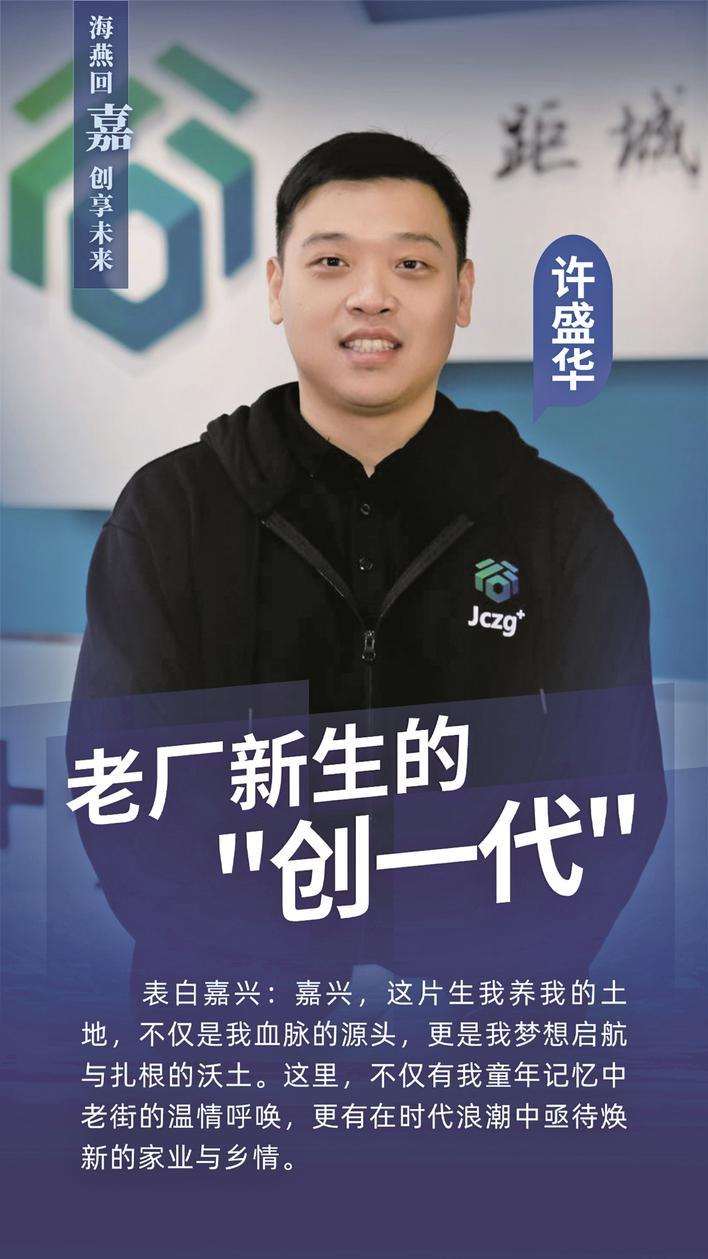 人物名片:许盛华,1989年出生于嘉兴平湖,毕业于美国麻省州立大学,2015年回国后在上海等地从事股权投资工作,2018年回到故乡创建“嘉创智谷”品牌,完成从“厂三代”到“创一代”的转变。目前他是浙江嘉创盛宇资产管理有限公司董事长、长三角人才一体化发展城市联盟引才大使、浙江省侨商会理事、第三届新锐光荣浙商、浙江省新生代企业家联谊会第四届理事会成员、嘉兴市侨商会常务副会长、平湖市人大代表。