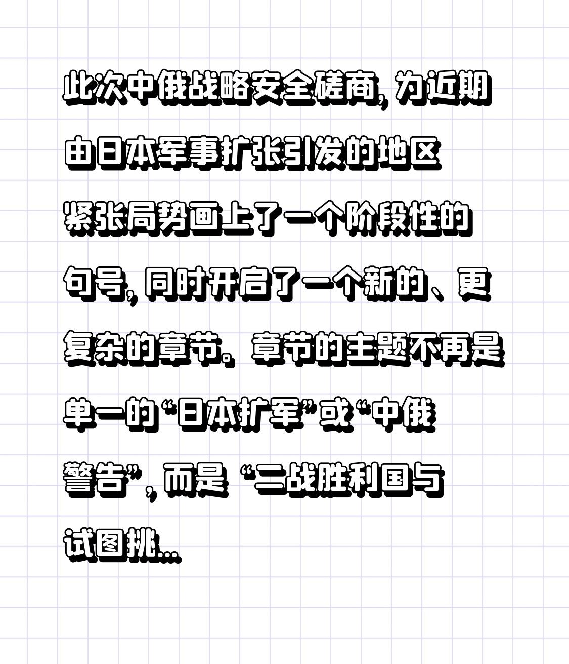 此次中俄战略安全磋商,为近期由日本军事扩张引发的地区紧张局势画上了一个阶段性的句号,同时开启了一个新的、更复杂的章节。章节的主题不再是单一的“日本扩军”或“中俄警告”,而是 “二战胜利国与试图挑战战后秩序的日本之间,关于东亚地区秩序主导权的博弈”。博弈的核心是历史解释权、安全规则制定权和发展道路选择权。 中俄双边关系 中俄合作演习