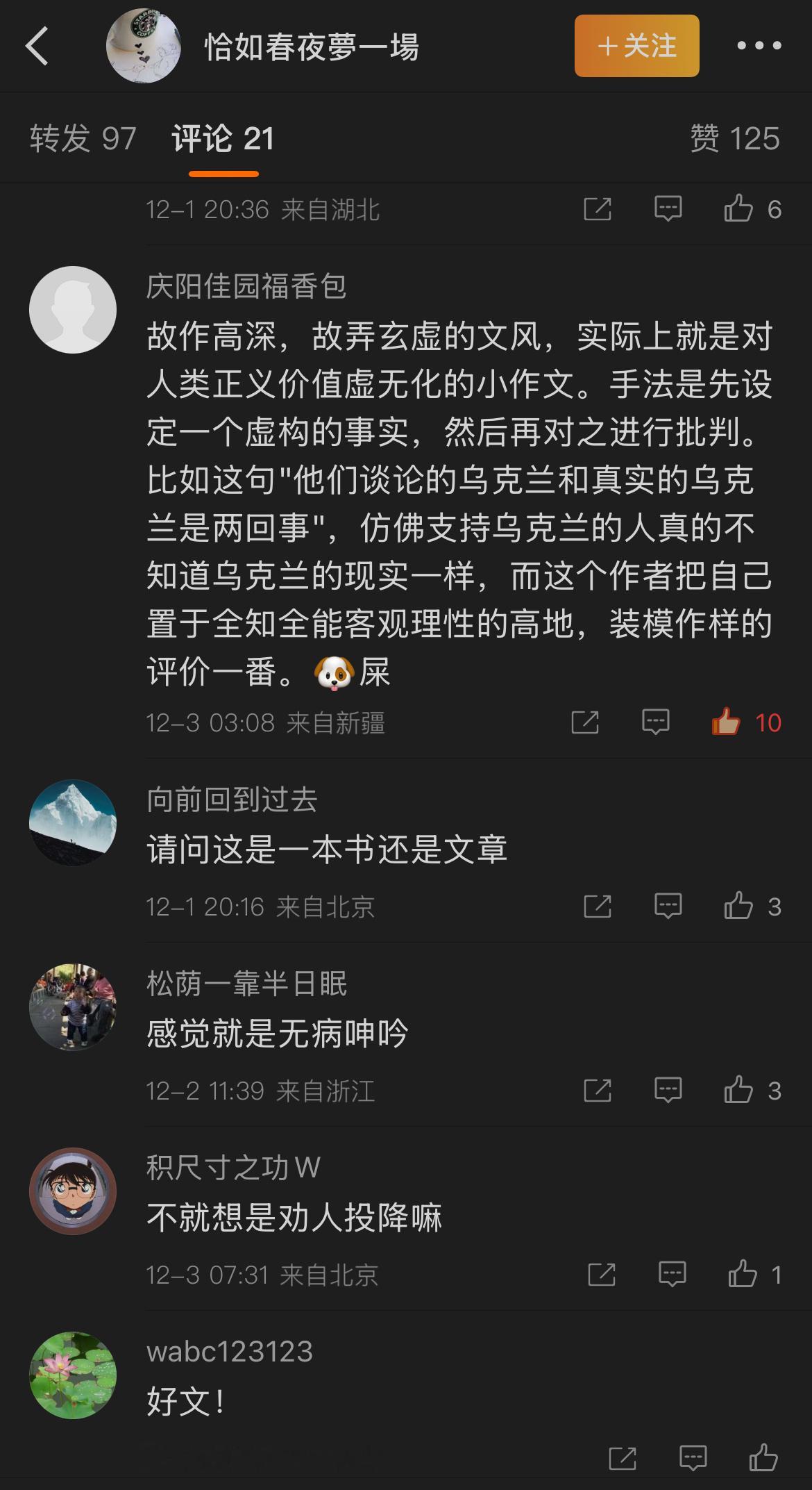 知道这块土地上自古以来历朝历代的文人武将出汉奸卖国贼数量远超地球🌍其它地方的原因了吧?// 但是战争除了有意识形态因素,还要遵从现实主义逻辑。这三年打下来,战场状况如何、伤亡数量如何、乌克兰还能否继续承受战争消耗、乌克兰内部多数人的意见如何、还有最关键的美国人还愿意继续为它输血?如果所有这些现实条件都对乌克兰不利,我不知道这场战争如何还能继续下去。如果乌克兰青壮年伤亡怠尽,知识分子心中的自由和正义就能实现? 战争打到这个阶段,尽量挽救更多乌克兰普通人的生命比任何高大上的意识形态都重要。因为真正在付出牺牲,承受代价的人不可能出现在媒体上,不可能坚持和自我感动于某种高尚理念,他们想的就是能活下去。我不觉得我有任何资格把自己的某种虚妄理念强加于他们。