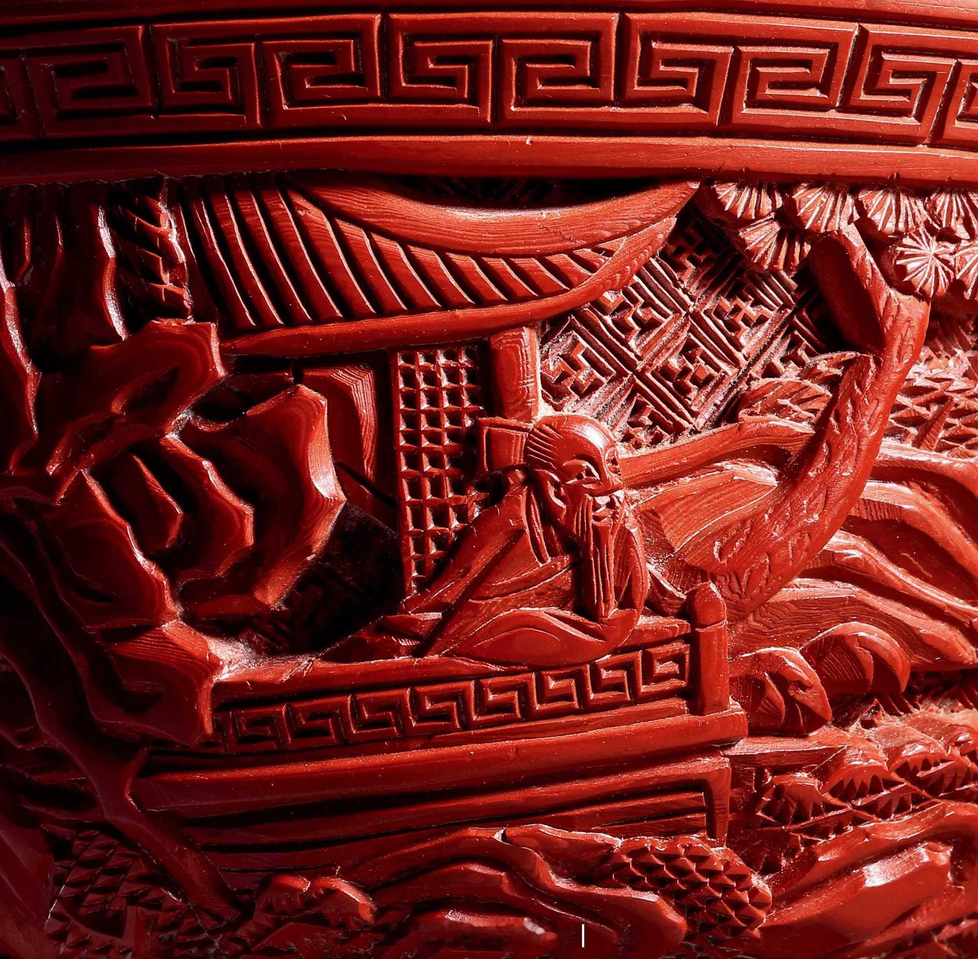 髹饰录 | 明晚期 剔红访友图高足杯备注:日本藏家旧藏杯敞口,弧腹,较深,高圈足,足底端外撇。外口沿剔红雕回纹,杯内及底髹酱色漆,外壁髹红漆。此样式又称马上杯,即高足杯,是宋元时期北方马背民族十分流行的一种器类,因骑马不便,故将杯足做成高足,以便马背上使用方便,尤其是蒙元时期,颇为流行,有金、银、瓷、漆等多种质地。明代景德镇御窑厂烧造高足杯类别较多。此件高足杯采用剔红雕漆工艺,层层堆漆,剔雕出人物故事图案,场景恢巨集连贯,人物刻画生动传神,十分难得,具有明代中期之画风。整器造型别致,雕工精细,纹饰丰富,是一件珍贵的明代漆制品。与明代弘治至嘉靖间的同题材青花瓷制高士图马上杯可互为印证。尺寸:高8.5cm;直径8.7cm来源:保利2025秋拍《醉花荫—海内外名藏漆器》