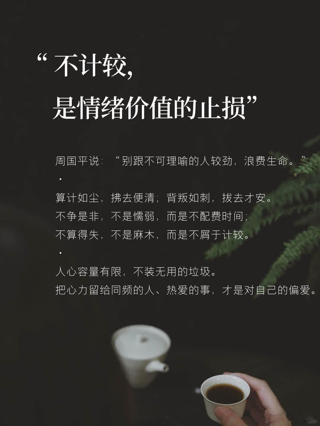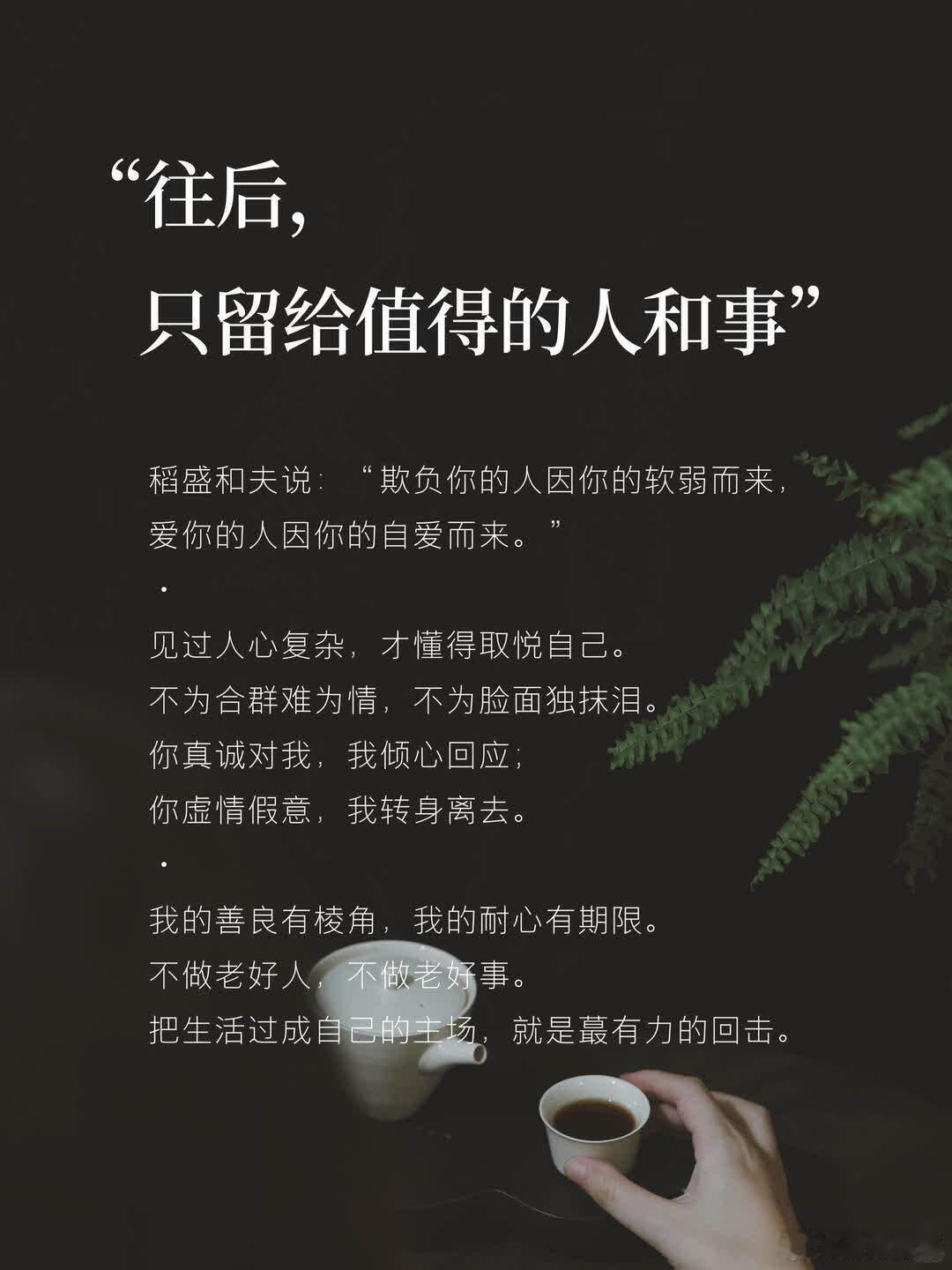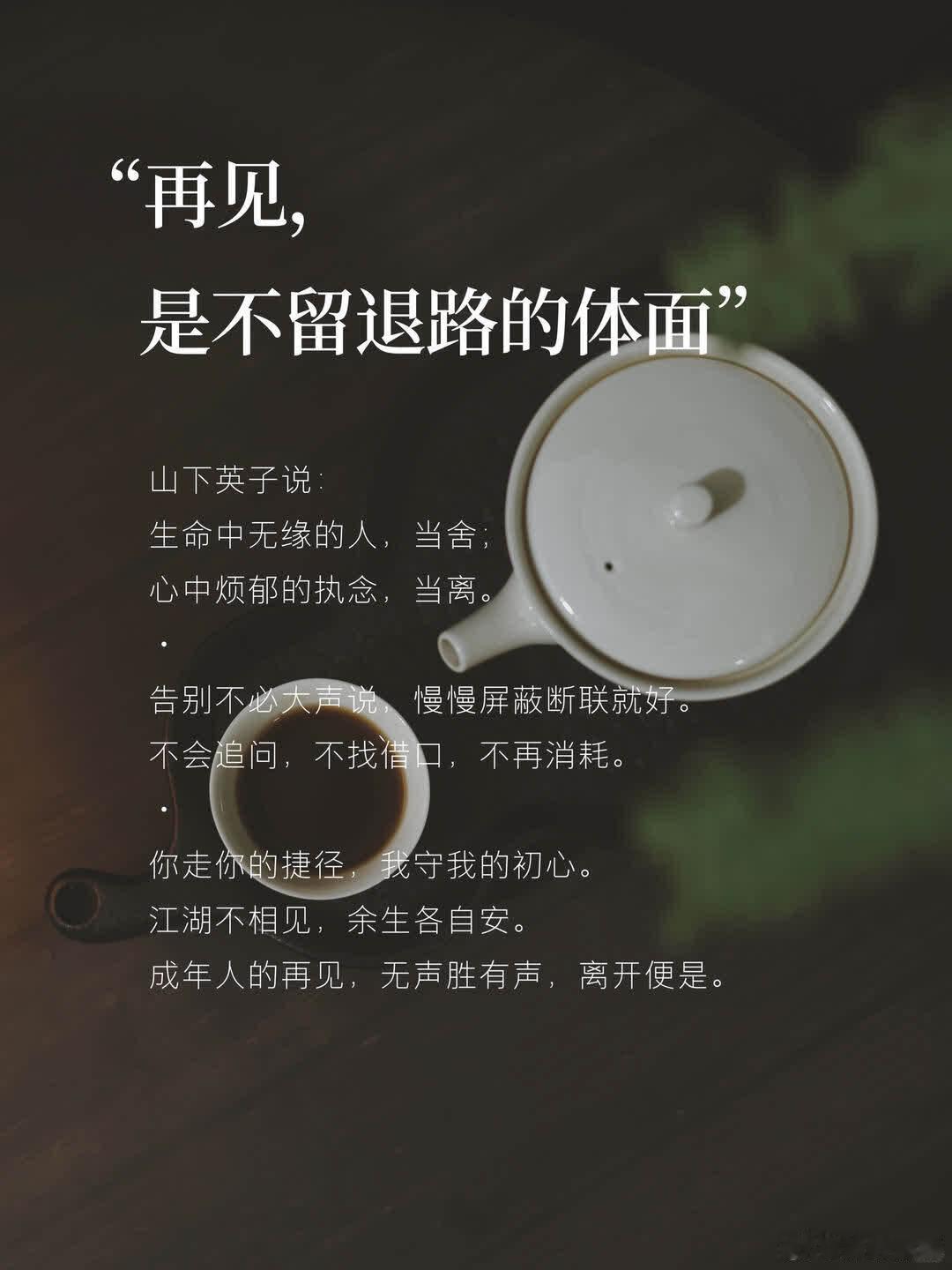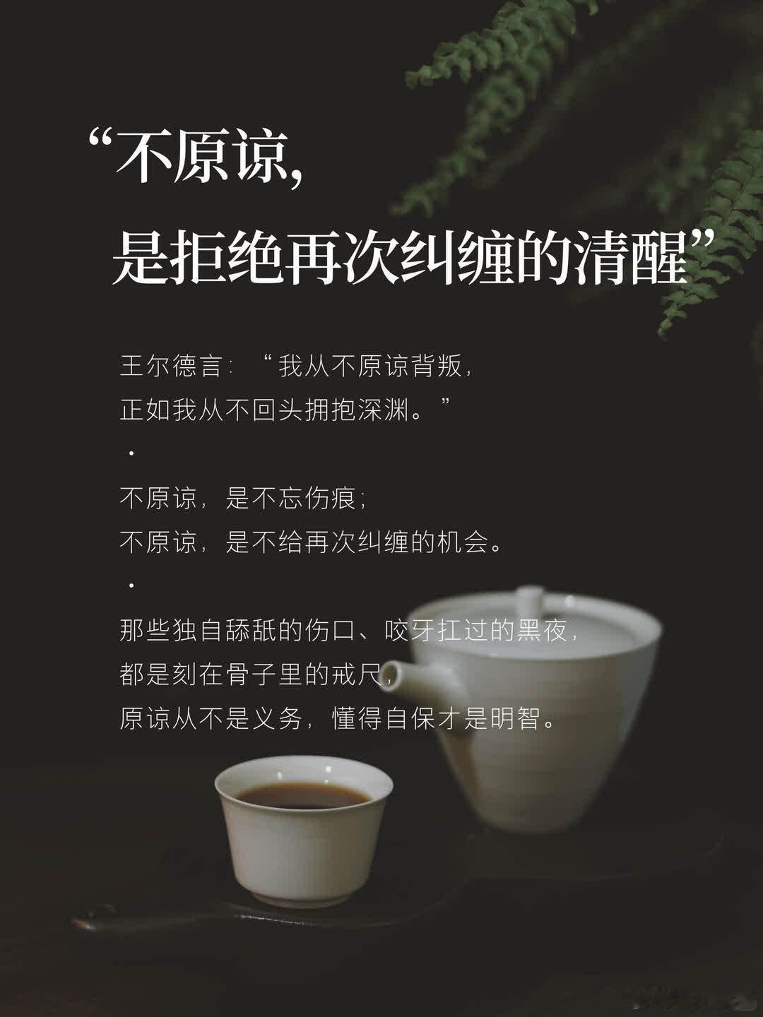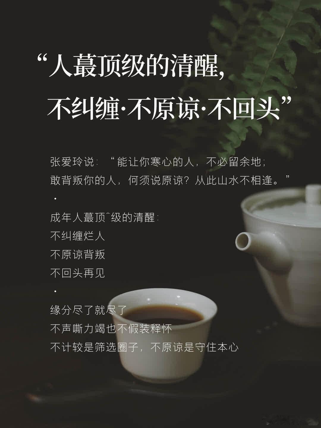 “不计较也不原谅,再见”~ 情感树洞[话题] 张爱玲说:“能让你寒心的人,不必留余地; 敢背叛你的人,何须说原谅?从此山水不相逢。” · 成年人蕞顶^级的清醒: 不纠缠烂人 不原谅背叛 不回头再见 · 缘分尽了就尽了 不声嘶力竭也不假装释怀 不计较是筛选圈子 不原谅是守住本心 01|不计较,是情绪价值的止损 周国平说:“别跟不可理喻的人较劲,浪费生命。” · 算计如尘,拂去便清;背叛如刺,拔去才安。 不争是非,不是懦弱,而是不配费时间; 不算得失,不是麻木,而是不屑于计较。 · 人心容量有限,不装无用的垃圾。 把心力留给同频的人、热爱的事,才是对自己的偏爱。 02|不原谅,是拒绝再次纠缠的清醒 王尔德言:“我从不原谅背叛,正如我从不回头拥抱深渊。” · 不原谅,是不忘伤痕; 不原谅,是不给再次纠缠的机会。 · 那些独自舔舐的伤口、咬牙扛过的黑夜, 都是刻在骨子里的戒尺, 原谅从不是义务,懂得自保才是明智。 03|再见,是不留退路的体面 山下英子说:“生命中无缘的人,当舍;心中烦郁的执念,当离。” · 告别不必大声说,慢慢屏蔽断联就好。 不会追问,不找借口,不再消耗。 · 你走你的捷径,我守我的初心。 江湖不相见,余生各自安。 成年人的再见,无声胜有声,离开便是。 04|往后,只留给值得的人和事 稻盛和夫说:“欺负你的人因你的软弱而来, 爱你的人因你的自爱而来。” · 见过人心复杂,才懂得取悦自己。 不为合群难为情,不为脸面独抹泪。 你真诚对我,我倾心回应; 你虚情假意,我转身离去。 · 我的善良有棱角,我的耐心有期限。 不做老好人,不做老好事。 把生活过成自己的主场,就是蕞有力的回击。 🍃 所谓人生, 不过是体验一场,取舍一场。 何必为不值得的人耗! · 不计较,是放过自己。 不原谅,是尊重过往。 余生不见,是重获新生。 · 弘一法师说:“你来皆大欢喜,你走两手空空, 唯^一属于你的,是你活着的每一个瞬间。” · 从此,眼底无是非,心中有丘壑, 过往皆为过往,未来尽是繁花。