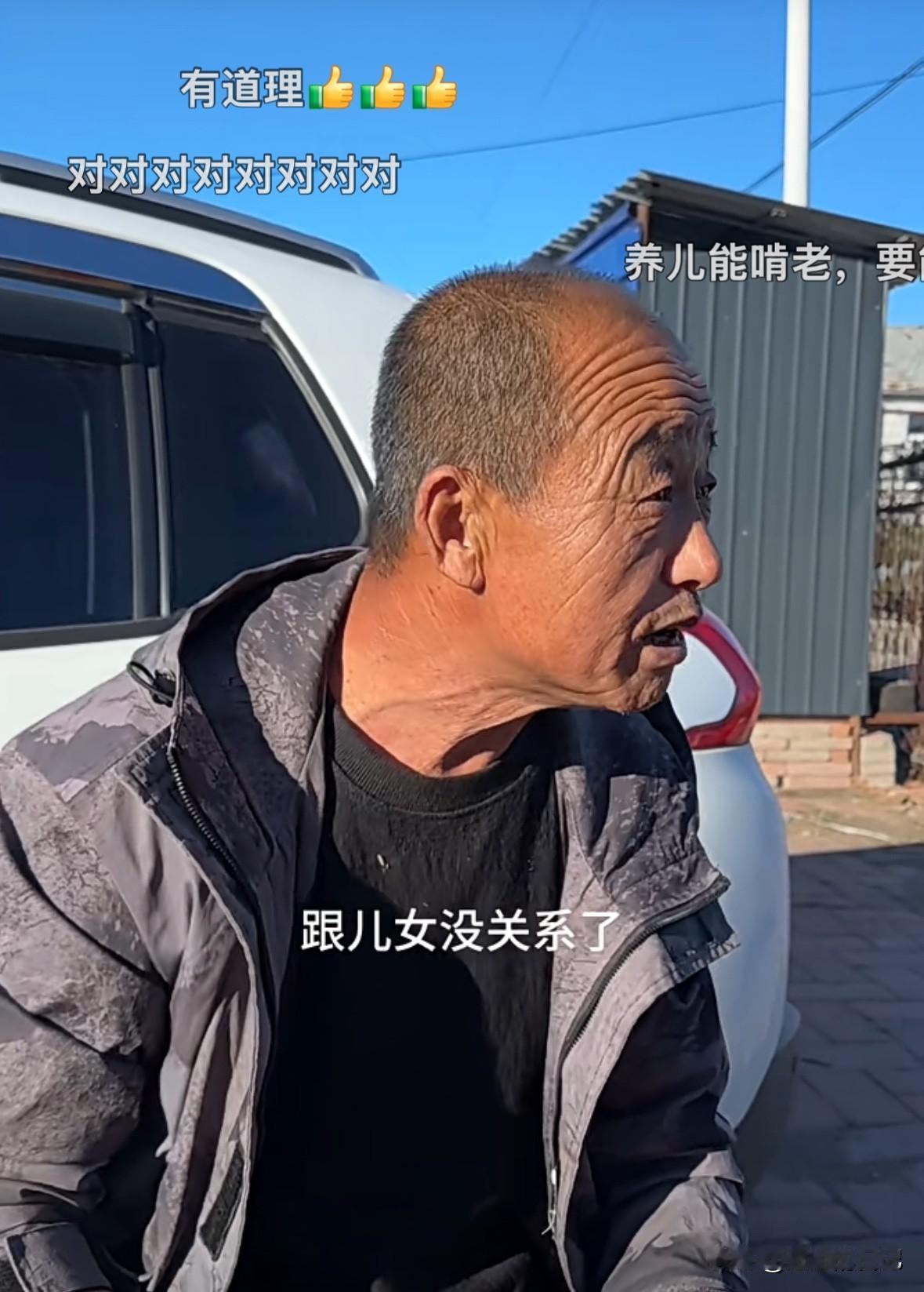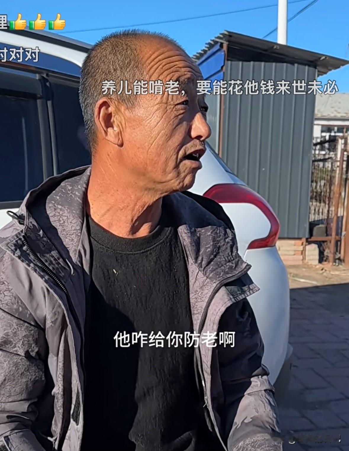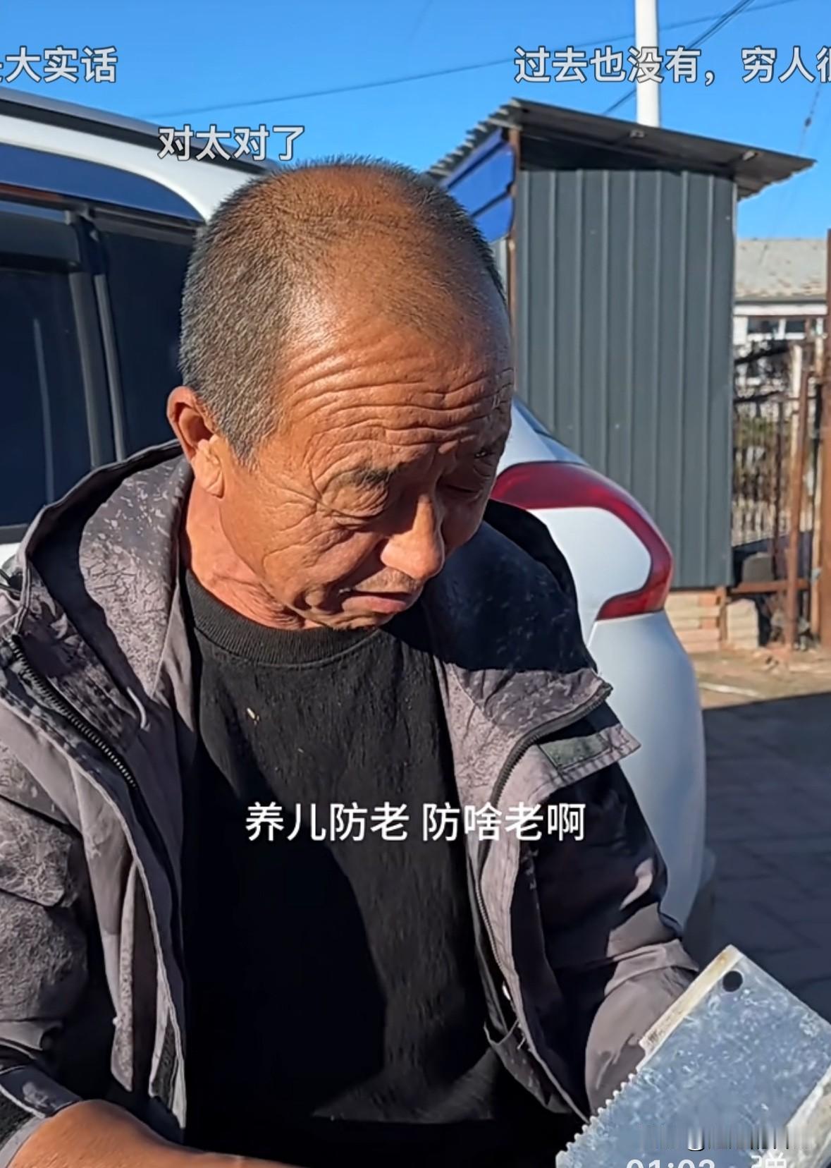 养儿到底能不能养老,听听这位农村大爷给大家总结的几条对不对。 一,你已经老了,他能不能活到老都不一定。 二,你都没经历过的给老人养老的事,你让他怎么给你养老, 三,他养家糊口压力那么大,他怎么给你养老,背着你去工作,还是天天守着你啥也不干。 四,现在的孩子都自私,以前人没了停三天,现在恨不得两个小时就给你变成灰,盆一摔,哭几声,都解脱了。 养儿不能防老,有时候,防儿才能养老。 细品,你细品,有时候碰到不争气的儿子,最后这句话还真对。