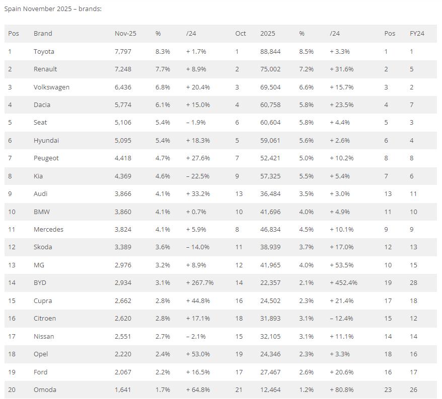 大家好,这里是极速车情。今天为大家带来西班牙汽车市场11月份的销量数据报告。 11月,西班牙车市继续高增长。名爵、比亚迪、奇瑞Omoda&Jaecoo乘着西班牙电动化转型的风潮,市占率一路高涨,中国品牌在西班牙市场正在加速渗透,奇瑞和比亚迪均创造最佳月销量记录。 2025年11月,西班牙新车销量同比增长12.9%,达94,124辆,实现连续7个月双位数同比增长。 2025年1-11月,西班牙累计销量同比增长14.7%,达1,045,638辆。 中国品牌表现出色: 名爵:2976辆,市占率3.2%。 比亚迪(+267.7%):创下销量和份额纪录,销量2934辆,排名第14,市占率3.1%。 奇瑞集团:奇瑞Ebro,销量1633辆,市占率1.7%,排名第21;奇瑞Jaecoo(+169.6%)销量903辆,市占率1%。奇瑞Omoda(+64.8%),销量1641辆,市占率1.7%,表现强劲;奇瑞集团销量4177辆,超过上个月的4058辆,创下销量和份额纪录,排名中国车企第一。 零跑:407辆。 领克:166辆。 SWM:51辆。 奔腾:47辆。 小鹏:31辆。 力帆:21辆。 东风小康:17辆。 东风:13辆。 北汽:5辆。 岚图:2辆。 腾势:1辆。