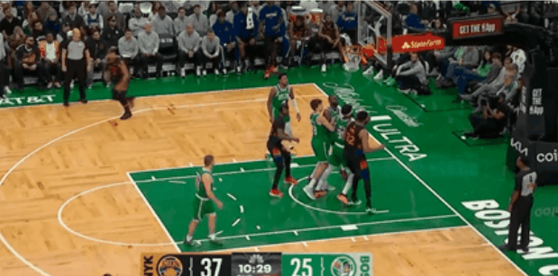 NBA常规赛,尼克斯对阵凯尔特人的比赛正在进行中。