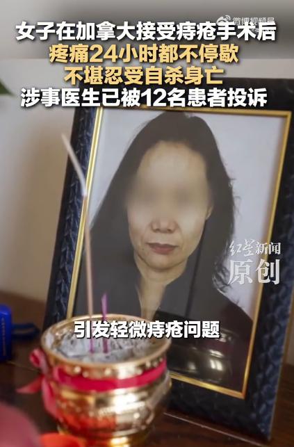 华裔女子痔疮手术后不堪剧痛自杀!医生早被12人投诉了还在行医 一个痔疮手术居然逼得人自杀了?一加拿大华裔女子花1600加元做激光手术,结果术后疼到没法走、没法躺,体重从160磅骤降到80磅,熬了18个月直接绝望轻生了! 涉事医生早被12个患者投诉过!官方查出他未经别人同意就擅自手术,“本质是拿病人身体做实验”,用的激光技术连医保都没纳入,安全根本没保障。 有没有做过痔疮手术的出来现身说法一下,这个做完真的很疼吗?没做过,没法感同身受。但是疼到跳楼是不是太夸张了!
