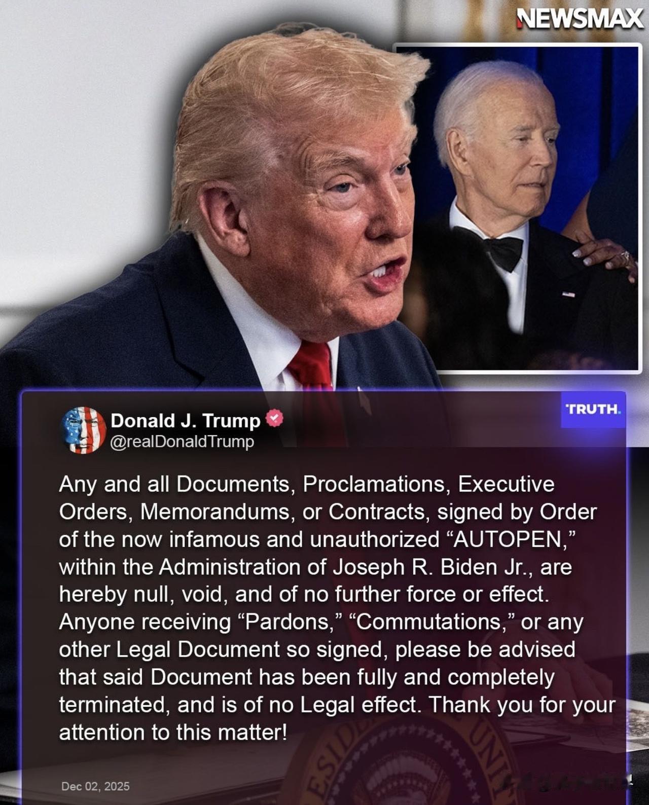 特朗普宣布,他已经“完全终止”前总统乔•拜登使用自动公开签署的每一个行动。 President Donald Trump announced that he has "completely terminated" every action signed by former President Joe Biden using the autopen. "Any and all Documents, Proclamations, Executive Orders, Memorandums, or Contracts, signed by Order of the now infamous and unauthorized 'AUTOPEN,' within the Administration of Joseph R. Biden Jr., are hereby null, void, and of no further force or effect," Trump said in a post to Truth Social. "Anyone receiving 'Pardons,' 'Commutations, or any other Legal Document so signed, please be advised that said Document has been fully and completely terminated, and is of no Legal effect," he added.