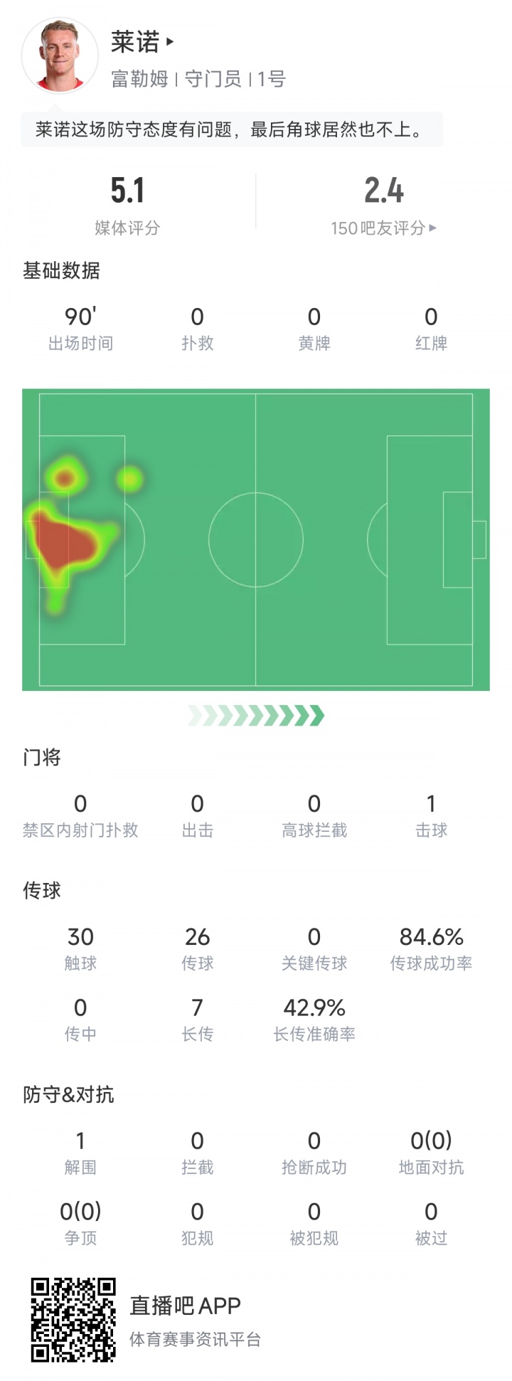 反观富勒姆门将莱诺,曼城4次射正,他丢了5球,评分也很低,更加无奈。