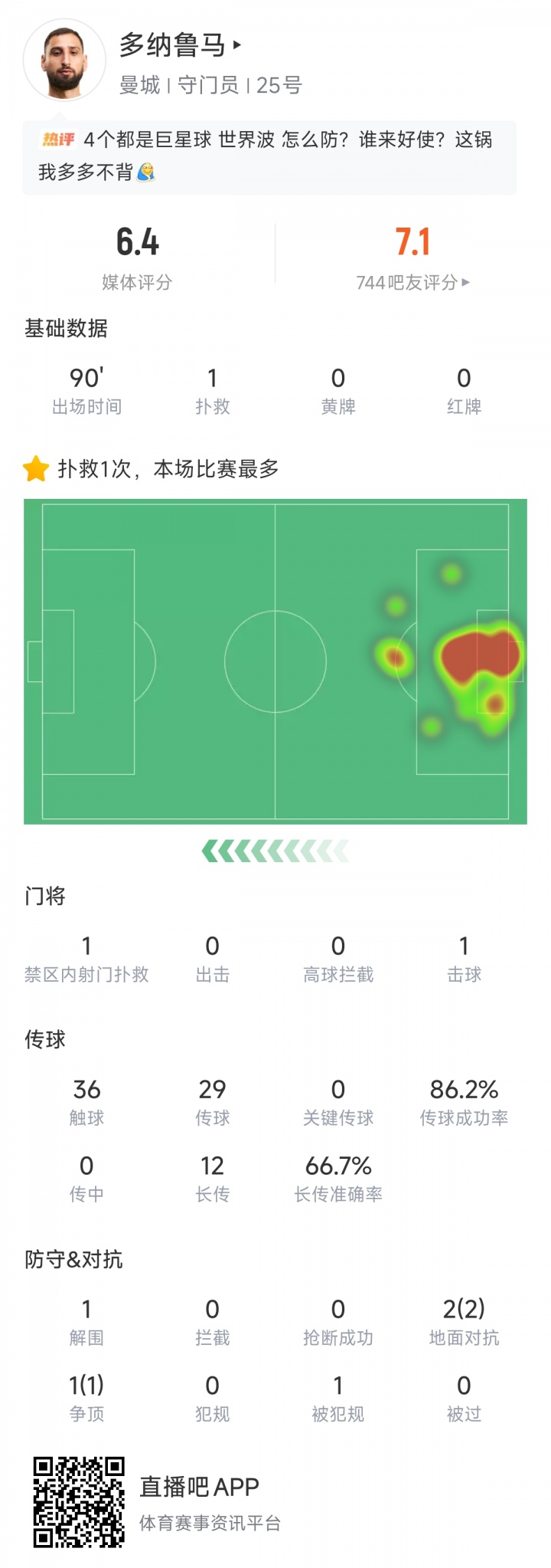 曼城门将多纳鲁马本场只有一次扑救,不过,因为富勒姆的进球基本都是爆射+神仙球,因此这位意大利国门评分并没有很糟糕。