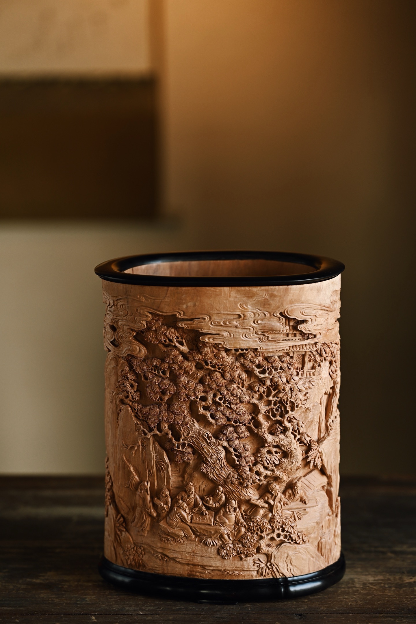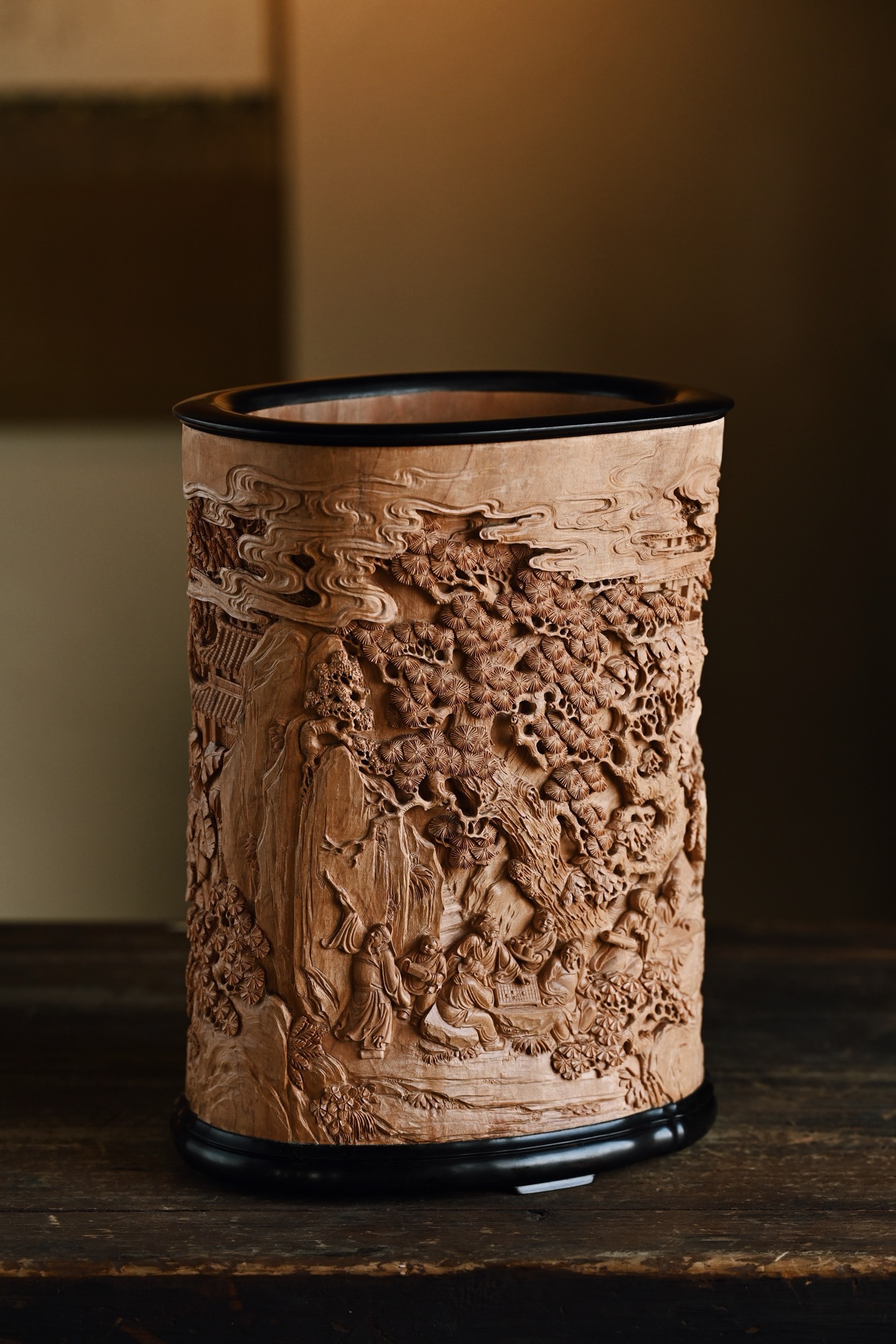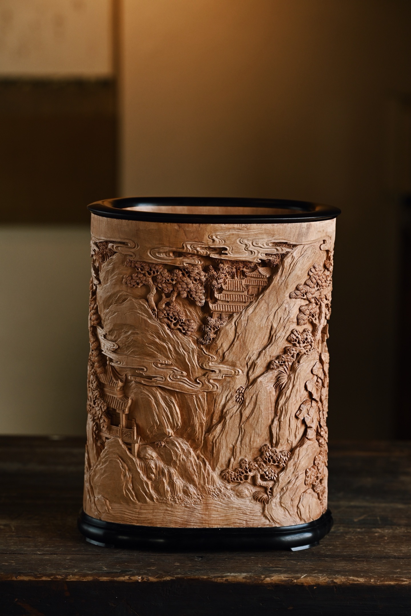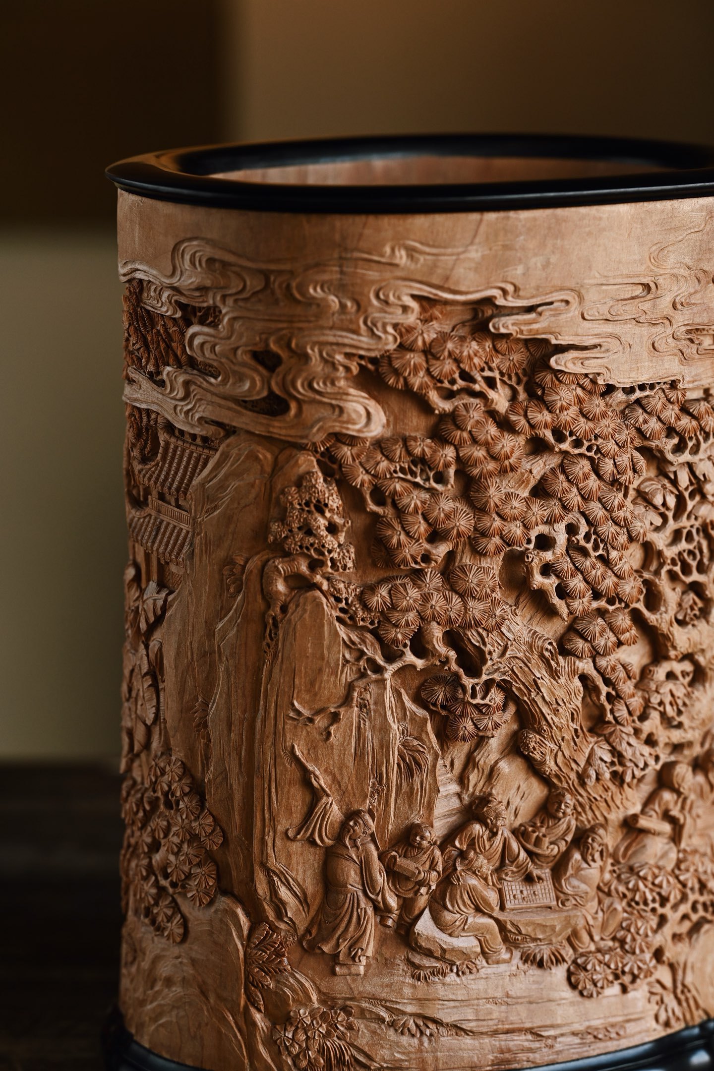 老山檀 | 琴棋书画 大笔筒老料香气浓郁,随形雕琢文士于山间陶然,琴棋书画诗酒畅达,苍松虬劲、山石磊落,目光所及之处无不生动形象,置文房意境深远。20.5*16.3*26.5cm 3491g